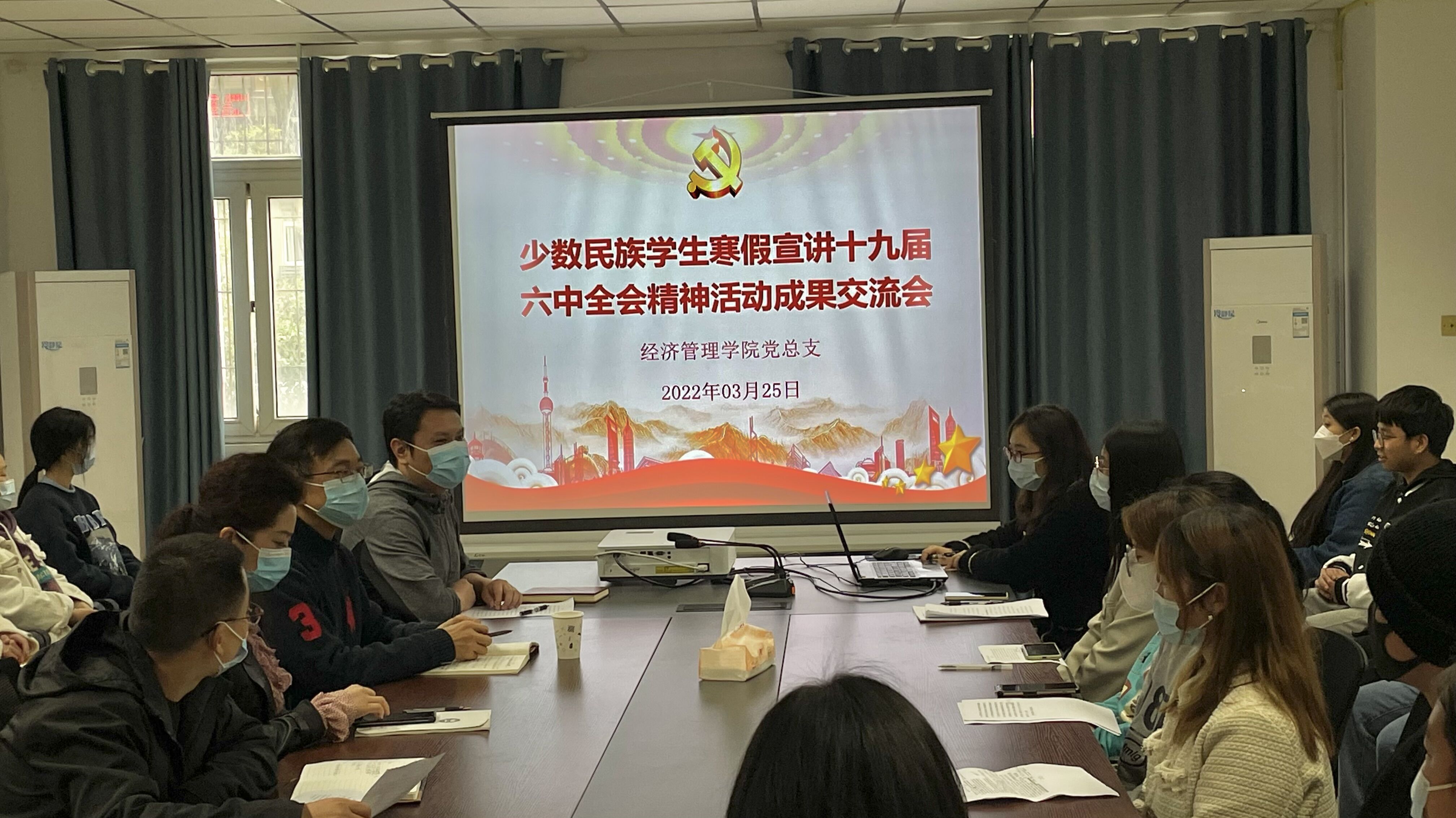 为了深入学习宣传党的十九届六中全会精神,贯彻习近平总书记关于牢铸中华民族共同体意识的重要讲话精神和中央民族工作会议精神,3月25日中午,经济管理学院在沙龙校区综合楼2楼会议室开展少数民族学生寒假宣讲十九届六中全会精神活动成果交流会。经济管理学院党总支书记、院长赵琳,副书记张恩广,各班学生代表及少数民族代表共40余参会。学院党委委员、统战部部长杨吉林受邀参加会议。
