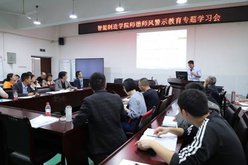 为进一步严明纪律,深化师德师风建设,充分发挥典型案例在师德师风建设中的警示作用。4月28日下午,智能制造学院在奥训楼308会议室开展了4月师德师风专题警示教育会。会议由智能制造学院党总支书记、院长熊江主持,全体教职工参会。
