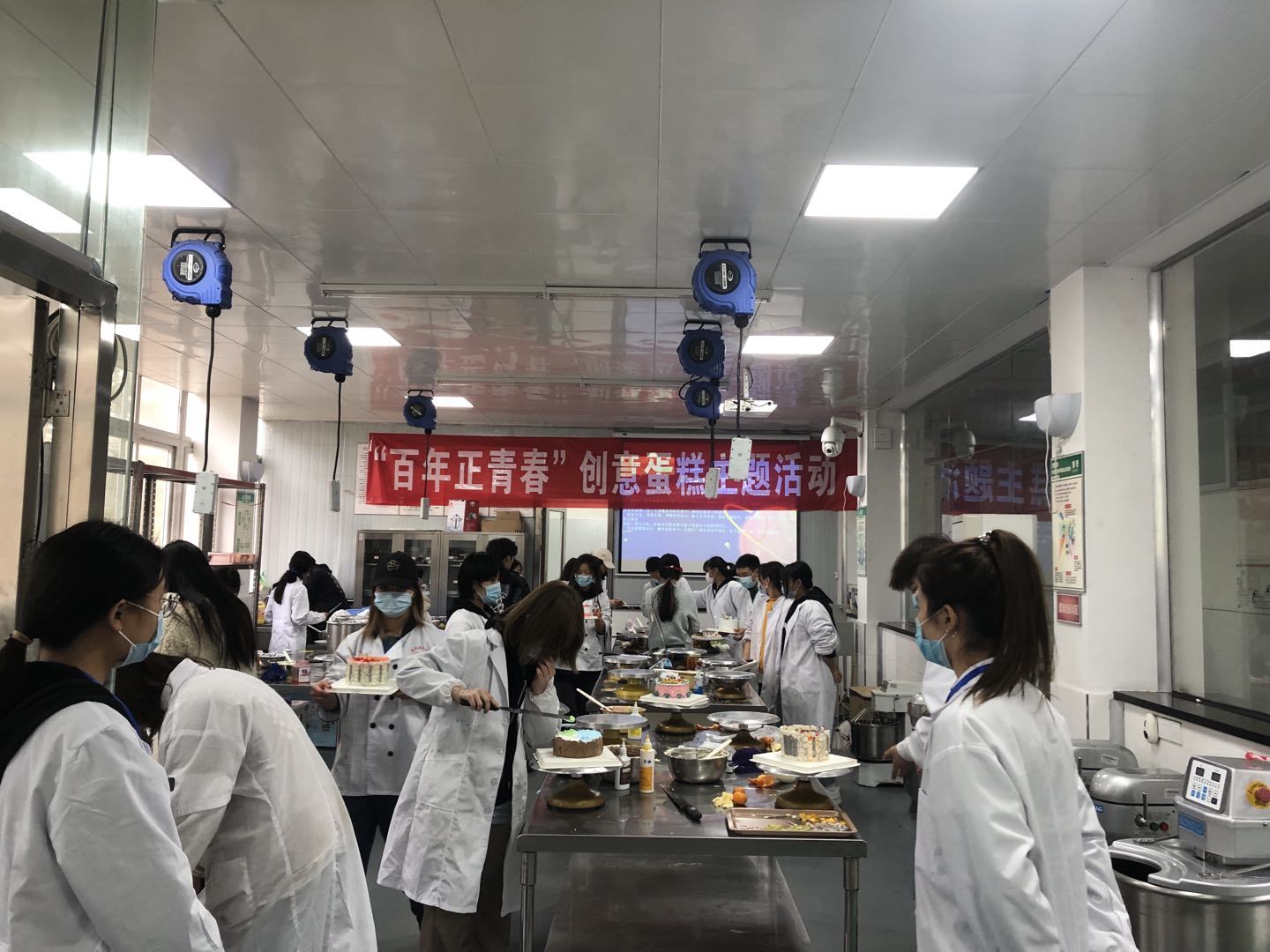烘焙社团开展了“百年正青春”创意蛋糕主题活动,会员们立足专业特色,通过创作出花样繁多的创意蛋糕,献上对团的百年华诞最真挚的祝福。经过几个小时的创作,各种充满奇思妙想的参赛作品一一制作了出来,糕点喷香诱人的味道在实验室里弥漫开来。在等待评审点评的时候,同学们对作品进行了欣赏,在互相欣赏的过程中相互学习,达到了共同进步提高的目的。