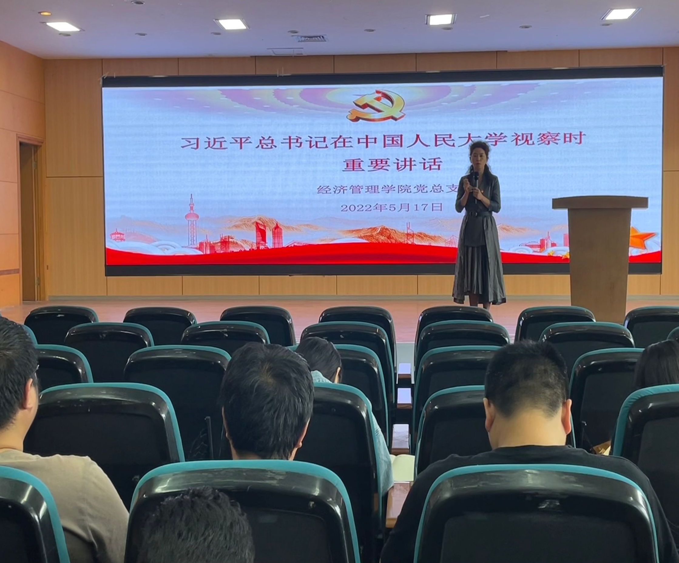 5月18日下午,经济管理学院全体教职工在沙龙校区综合楼2楼学术报告厅开展政治理论学习会,会议由经济管理学院专职组织员李静主持。