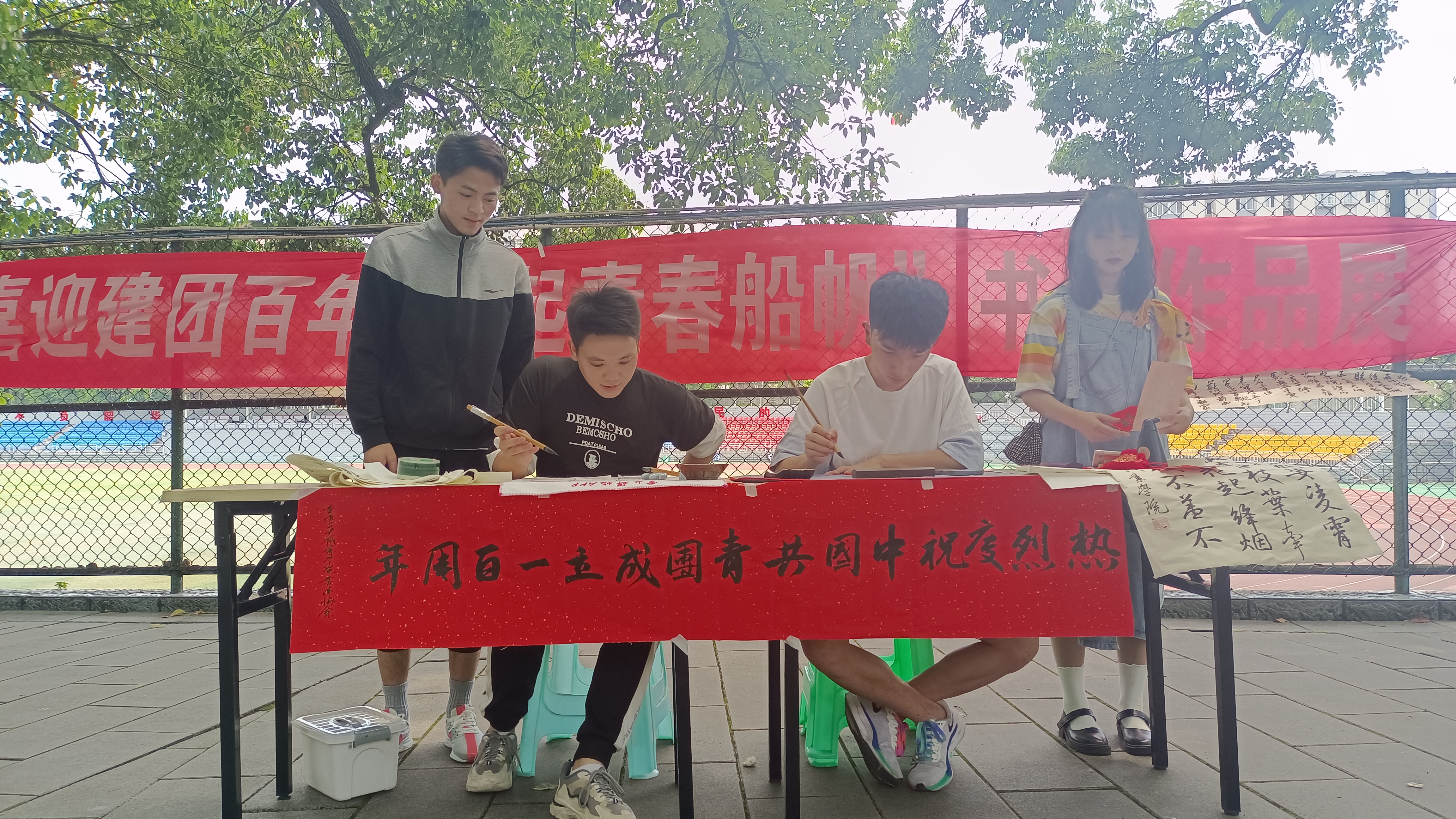 书法协会开展了“喜迎建团百年 扬起青春船帆”活动,社团在全院征集了百余幅的书法作品,在樟树林进行了展览,并邀请了过往师生进行现场书写。活动现场,每一位作者都用手中的笔将饱满热情和永远跟党走的决心与奋进新征程的信心尽情地抒发出来,既表现出中华民族传统的豪气与风格,又表现出当代青年人的激情与情怀。