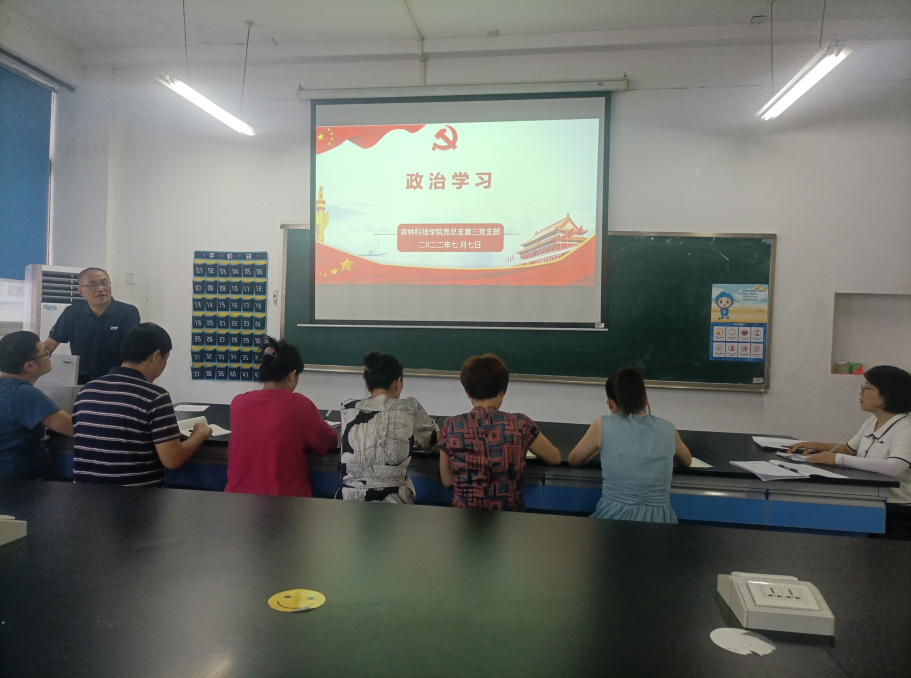 7月7日中午,农林科技学院第三党支部在农林楼707室召开党员大会,进行了7月份的政治理论集中学习,本次会议由支部书记汪立同志主持,第三党支部全体党员同志共10人参加本次会议。
