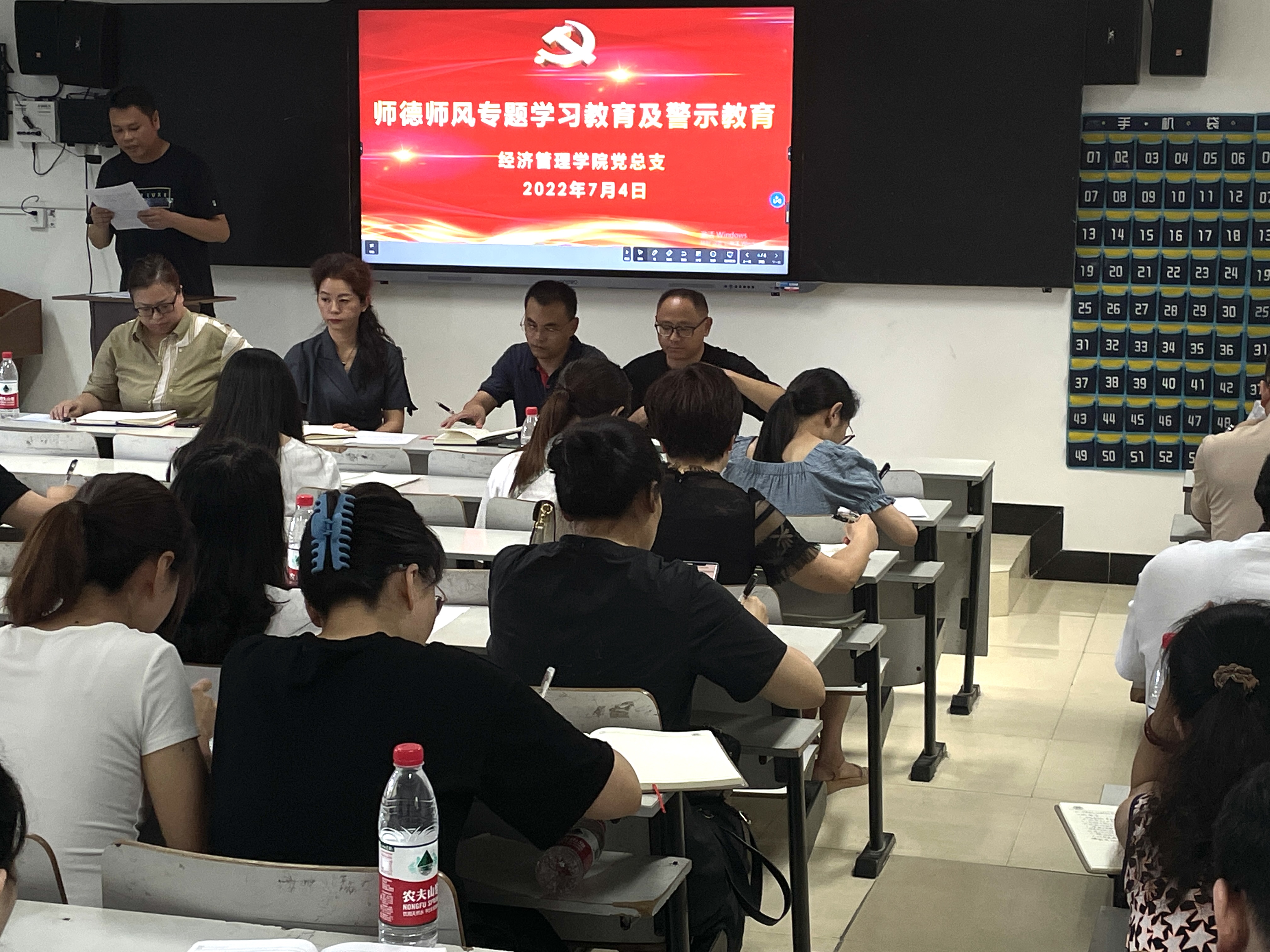 为引导全体教师增强敬业修德、奉献社会的责任感和使命感,争做“四有”好老师,建设一支高素质专业化创新型教师队伍,7月7日下午,经济管理学院在沙龙校区组织召开师德师风专题警示教育大会,全体教职工参加会议。