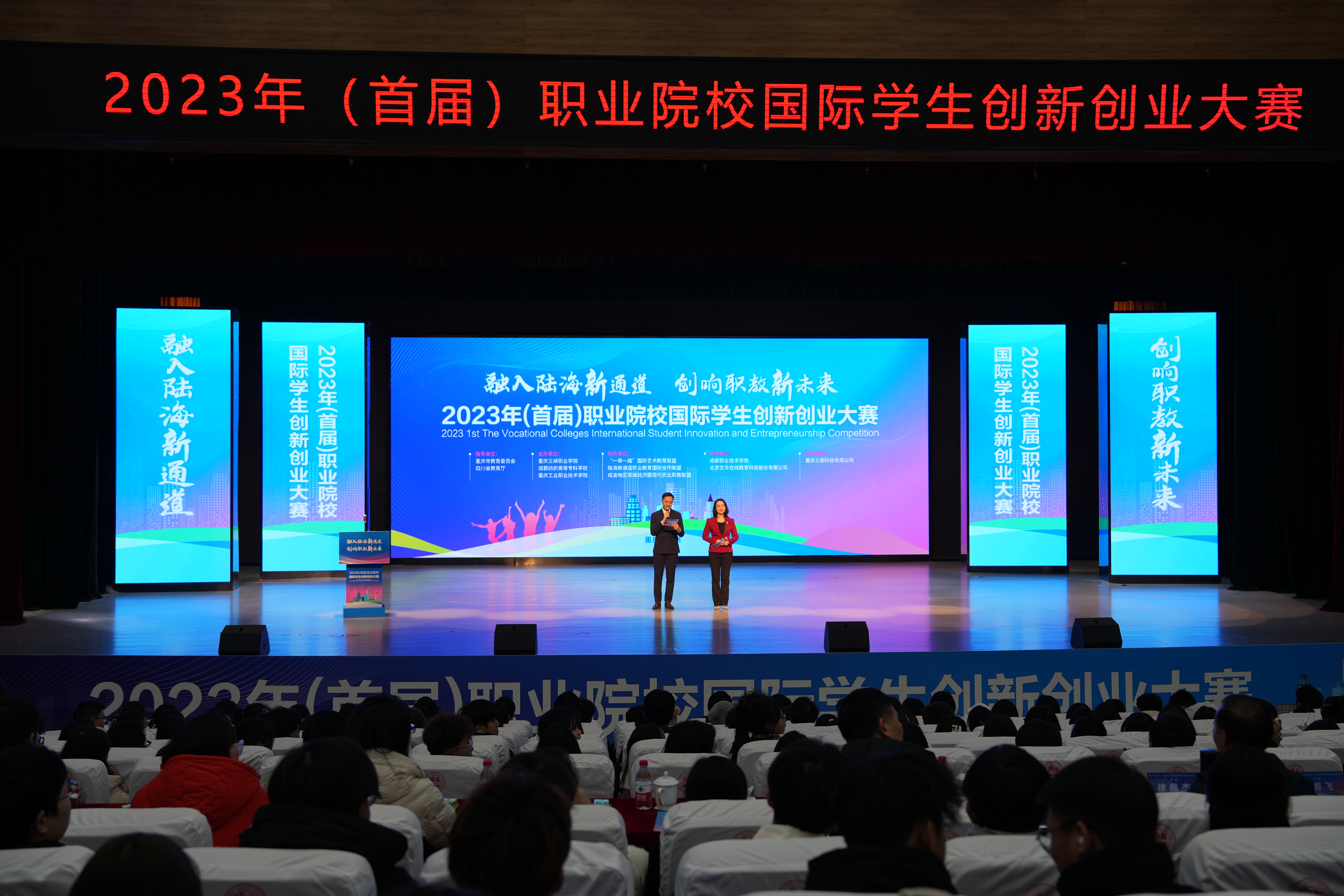 为深入贯彻落实党的二十大报告关于加快建设西部陆海新通道的重大战略部署,认真落实《国务院关于推动创新创业高质量打造“双创”升级版的意见》文件精神,进一步整合西部陆海新通道区域内职业教育资源,推动成渝地区双城经济圈建设,促进成渝地区留学生创新创业,12月22日下午,在重庆市教育委员会、四川省教育厅指导下,由我院、成都纺织高等专科学校、重庆工业职业技术学院主办的2023年职业院校国际学生创新创业大赛决赛在我院顺利举办。学院党委书记谈建成、党委委员 副院长赵福奎出席会议;大赛邀请了创业导师以及相关领域专家学者担任评委。经过各有关学校推荐、初赛、复赛,来自重庆、成都、西宁、锡林等地的14所职业院校的代表队参加决赛。