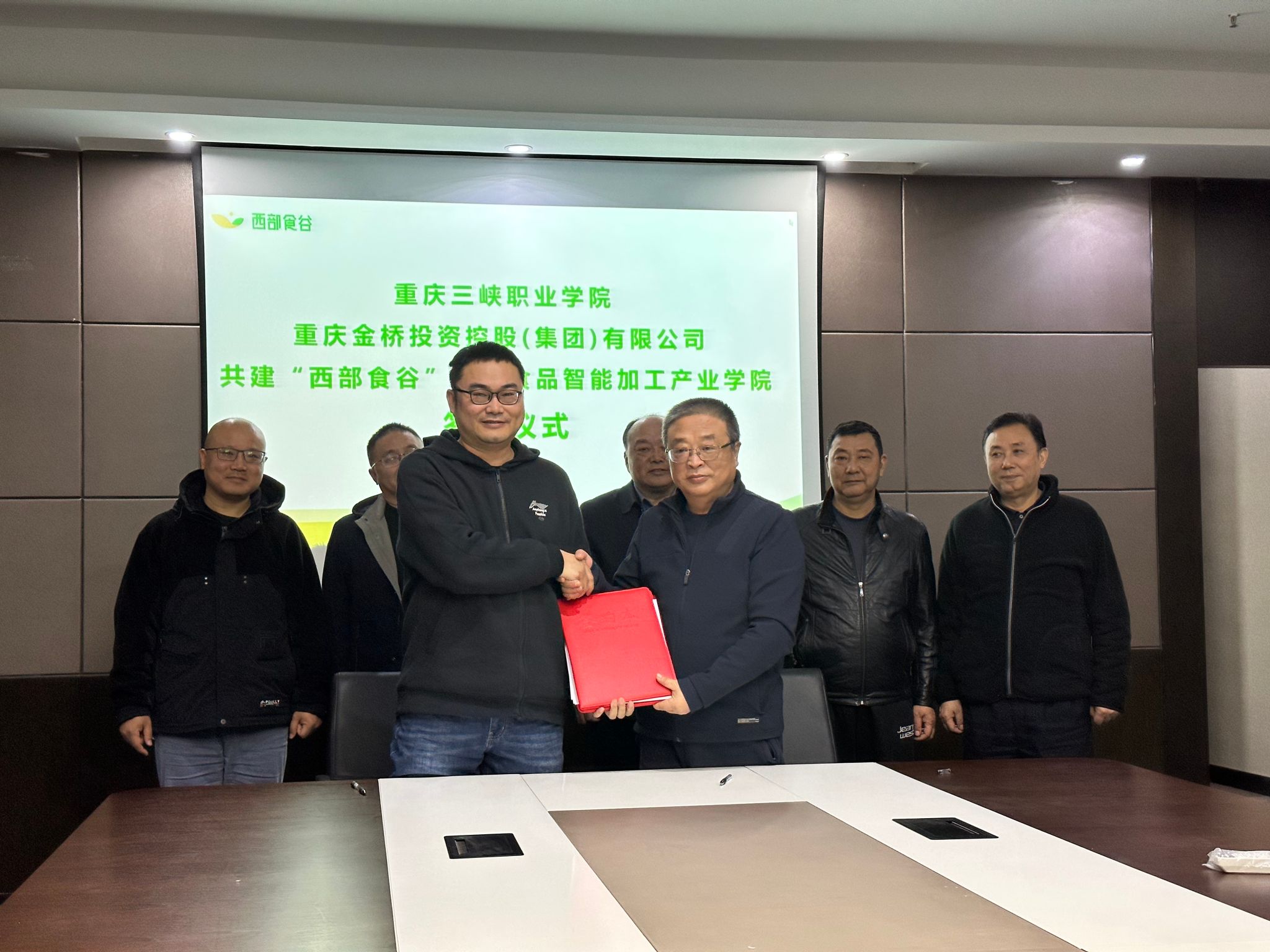 近日,学校与重庆金桥投资控股(集团)有限公司共建“西部食谷”现代食品智能加工产业学院签约仪式,在江津区西部食谷创新创业中心举行。农林科技学院副院长覃贵勇、金桥集团董事长罗其胜、农林科技学院食品专业教师代表及西部食谷相关负责人共同出席签约仪式。
