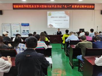 为深入学习贯彻习近平总书记“七一”重要讲话精神,切实增强“四个意识”、坚定“四个自信”,做到“两个维护”,推动党史学习教育走深走实。按照学院党委总体安排,10月12日下午,智能制造学院党总支书记、院长熊江在奥训楼308会议室为学院师生作了习近平总书记“七一”重要讲话精神宣讲。会议由智能制造学院党总支专职组织员杨德君组织,党员师生、教职工、入党积极分子、学生代表等70余人参加了学习。