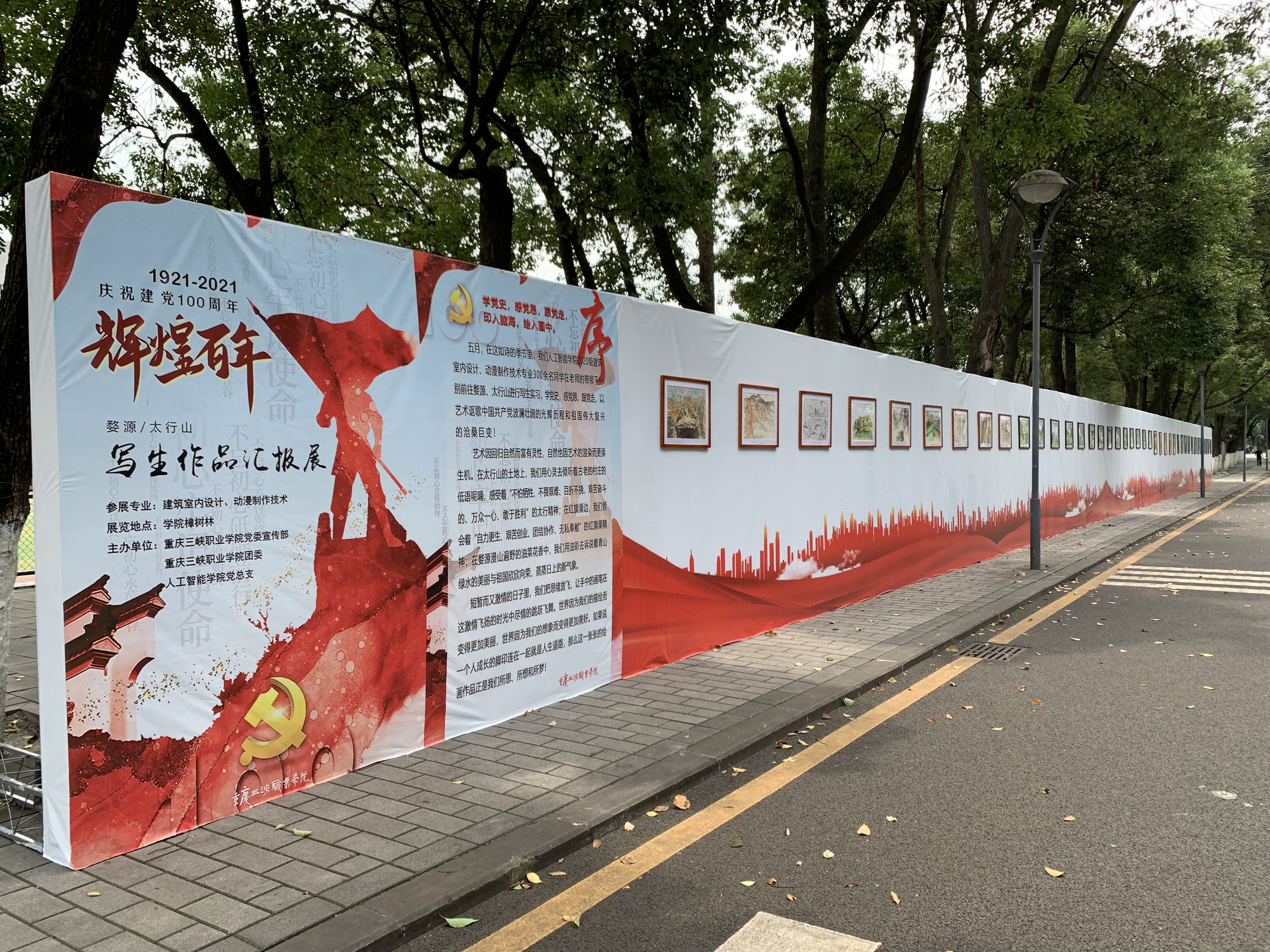 学党史,感党恩,跟党走,印入脑海,汇入画中。以艺术形式开展党史学习教育,讴歌祖国的伟大复兴与中国共产党波澜壮阔的光辉历程。2021年6月15日-6月18日,人工智能学院党总支在学院樟树林开展庆祝建党辉煌百年,2020级建筑室内设计和动漫制作技术专业学生写生作品汇报展。本次写生作品汇报展得到学院宣传部和团委的大力支持,展出写生作品300余幅,其中红色写生作品40幅。