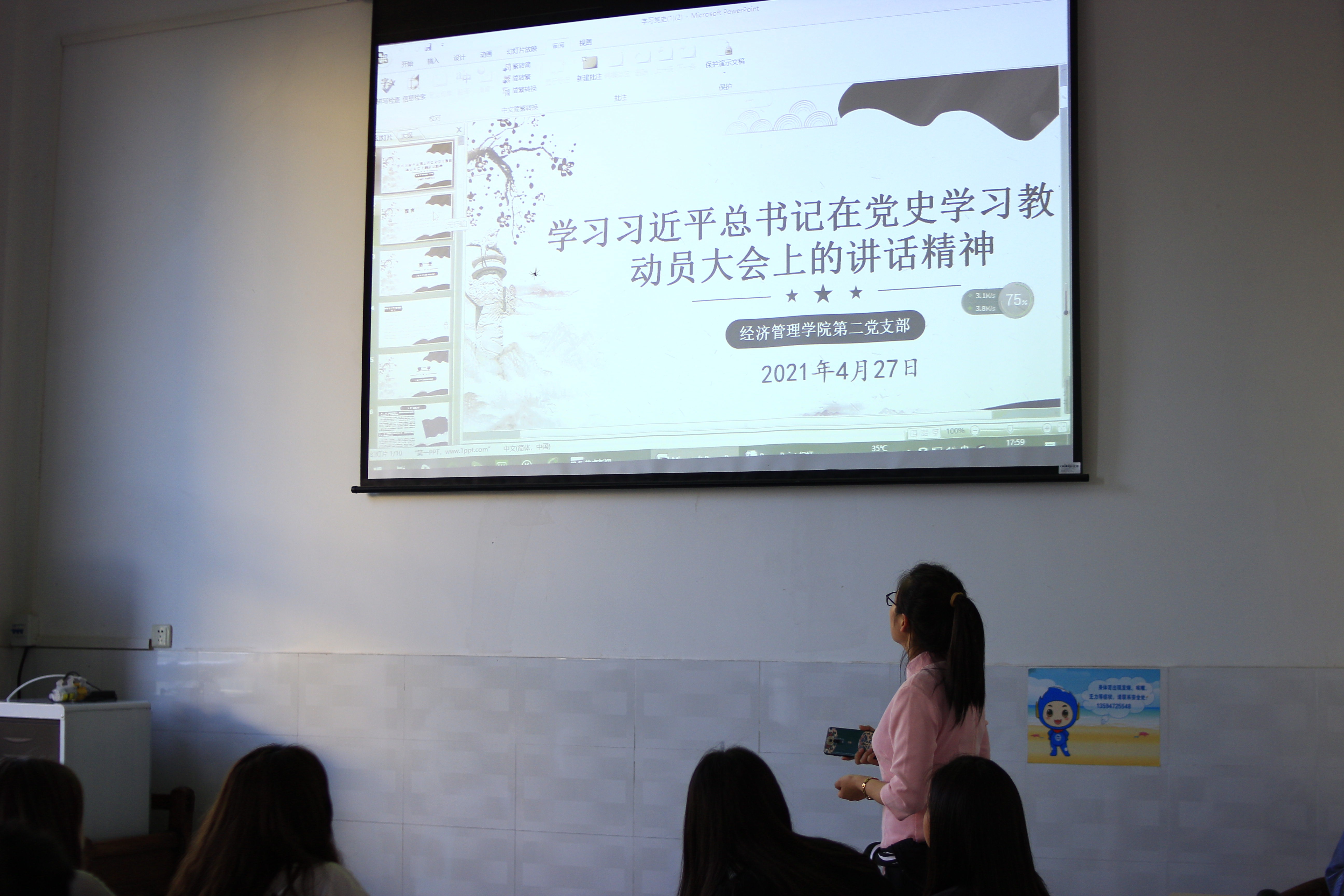 为持续深入开展党史学习教育,2021年4月27日,经济管理学院党总支第二党支部举行了第二期专题学习,来自酒店、物流、家政专业的41名学生积极分子在酒店实训室参加了学习。