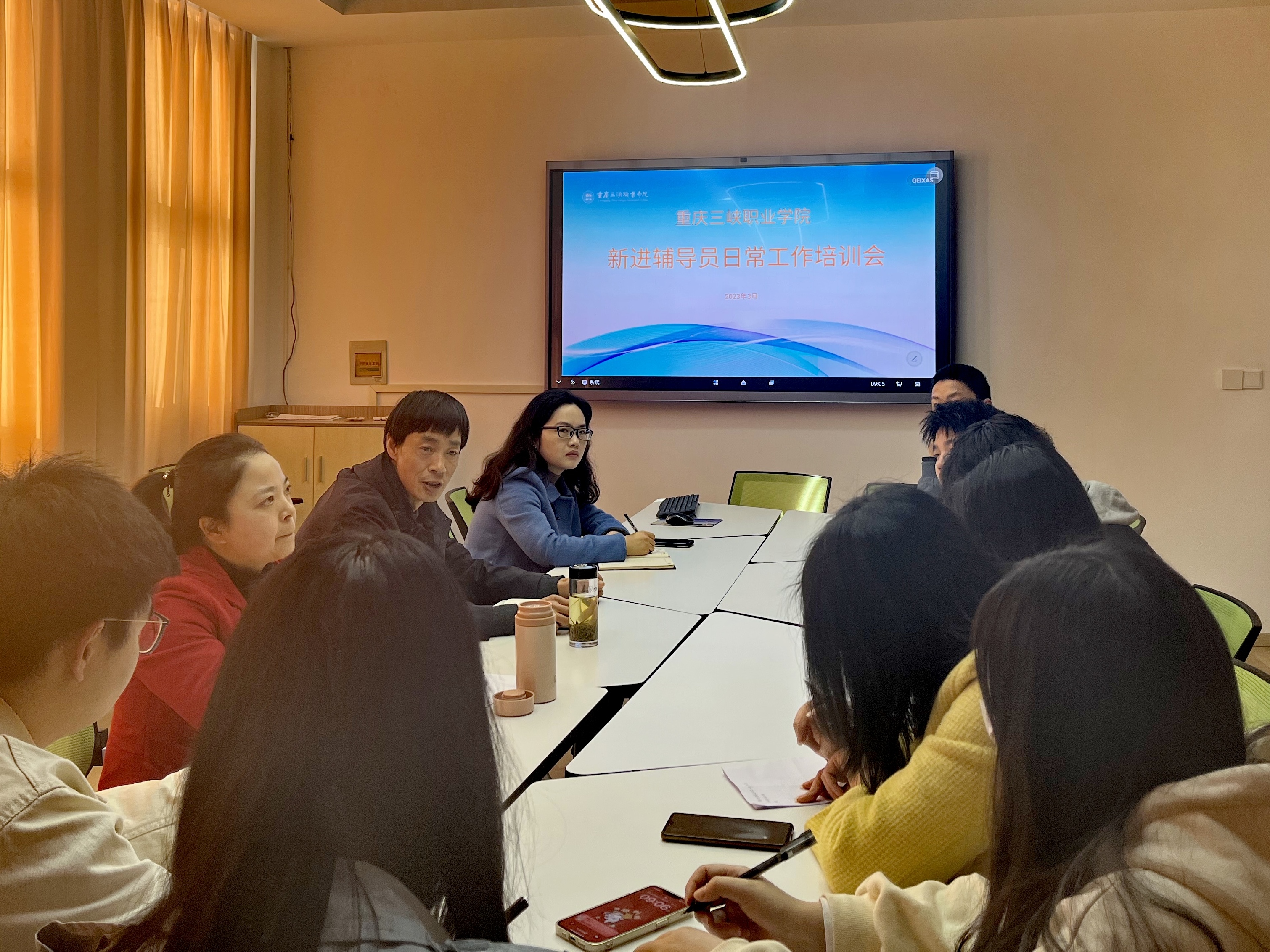 3月21日上午,学生处在行政楼216举办新进辅导员培训会,学生处副处长陶毅、卢文凤、彭钦,心理咨询教师熊倩以及新入职的8名辅导员参加本次培训会。