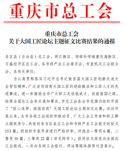 为认真贯彻落实习近平总书记致首届大国工匠创新交流大会贺信精神,广泛宣传培育大国工匠的经验做法和工匠人才的先进事迹,进一步激励全市广大职工走技能成才、技能报国之路,按照全国总工会有关通知要求,重庆市总工会在全市范围内组织开展了“匠心逐梦、强国有我”大国工匠论坛主题征文比赛。经专家学者严格评审,我院工会委员会选送的培训学院(乡村振兴学院)曾理院长撰写的《高职院校如何发挥职业技能培训主阵地作用》和动物科技学院宋杨老师撰写的《乡村振兴背景下涉农高职大学生劳动精神培育策略探析》荣获三等奖。