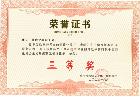 为充分展现重庆市教科文卫体系统广大职工建功“十四五”、奋进新征程的时代风采,6月29日,“学习新思想 奋进新征程”重庆市教科文卫体系统学习贯彻习近平新时代中国特色社会主义思想职工诵读比赛决赛在重庆文化艺术职业学院举行,我院工会委员会选送的禚家兴老师《中华颂》荣获三等奖。