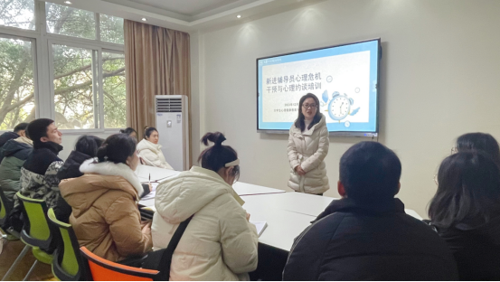 为进一步提升新入职辅导员应对心理危机事件的能力,做到学生心理健康问题早发现、早诊断、早干预,12月22日,学生处组织新入职辅导员开展心理危机干预与心理约谈培训。学生处副处长彭钦参会,心理健康教育指导中心罗金凤老师担任主讲,中心专职心理老师和全院15名新入职辅导员参加培训。