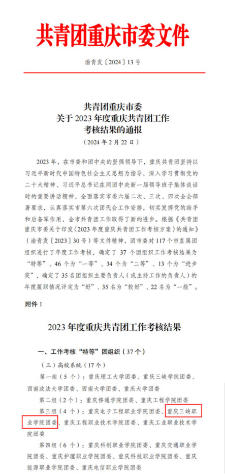 近日,共青团重庆市委六届三次全会顺利召开,会议通报了2023年度重庆共青团工作考核结果。我院共青团工作考核结果为“特等”。