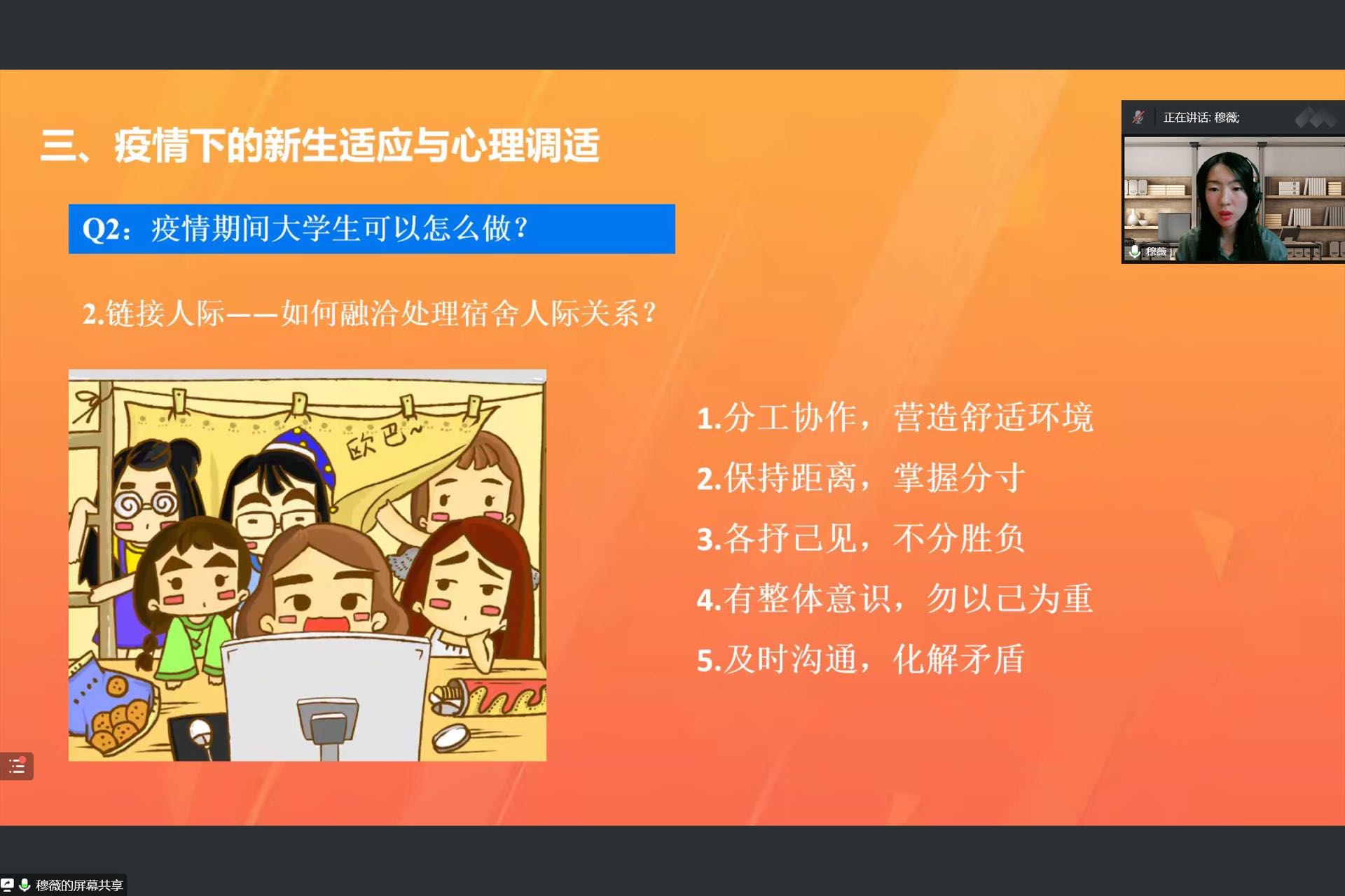 9月20日-29日,大学生心理健康教育指导中心为2022年新生开展了线上心理健康教育专题讲座。三位心理健康老师从我校“10·25”心理健康宣传教育活动的开展入手,倡议大家积极参与心理健康教育活动,在活动中敞开心扉、互助成长;向大家科普了心理健康的基础知识,希望大家关注心理健康,积极采用心理咨询等方式解决自己的心理困惑和问题;结合静默管理期间的新生心理特征,从情绪、人际、学习、时间管理等方面向大家提出适用的调适方法。
