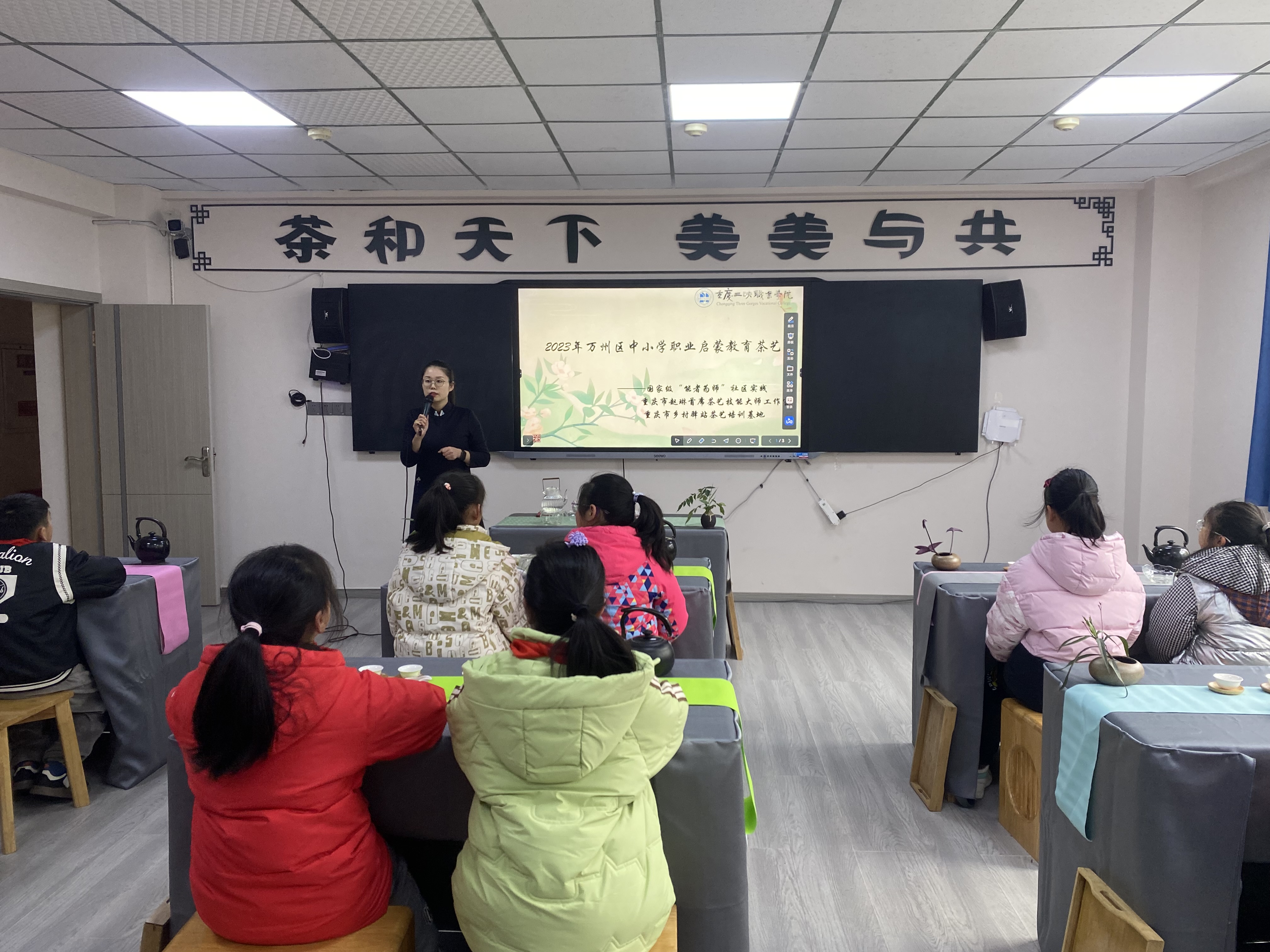 为贯彻落实市教委、区府《关于推动万州区职业教育高质量发展加快渝东北三峡库区城镇群建设的意见》(万州府发〔2023〕1号)精神,促进全区中小学生形成健全人格和良好的思想道德品质,树立正确的职业观、劳动观和人生观,推动职业教育资源面向基础教育开放,12月19日,万州区中小学生职业启蒙教育活动之茶艺习礼在沙龙校区赵琳茶艺技能大师工作室举行,来自与学院“手拉手”合作的南京小学60余名小学生参加了茶艺启蒙培训学习。