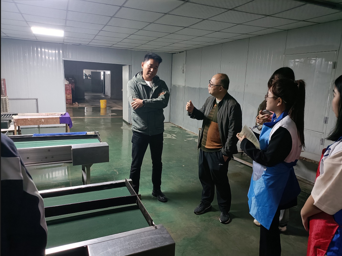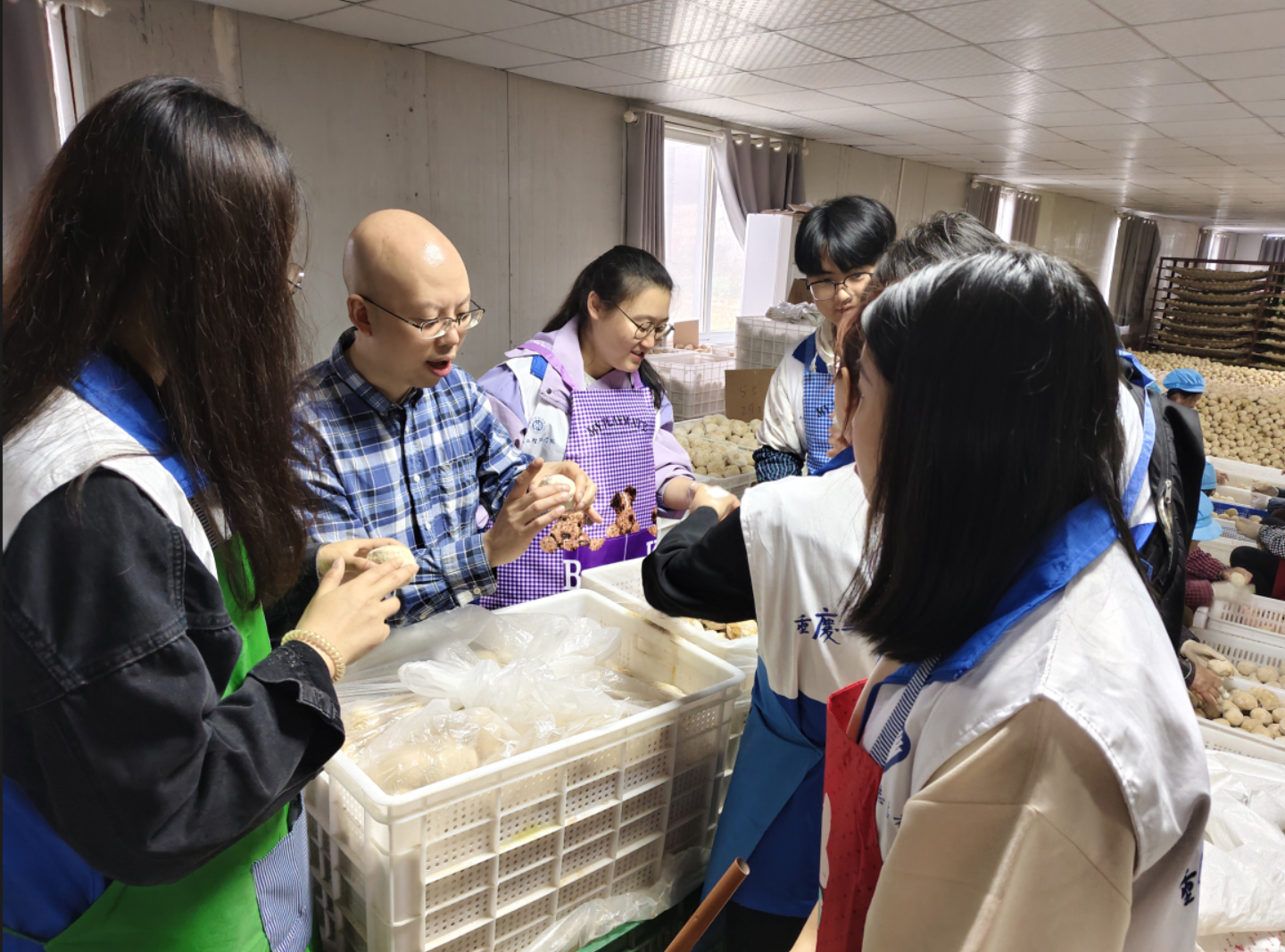 团队成员们在盛源丰皮蛋厂仔细聆听了皮蛋厂负责人陈总对于皮蛋加工整个流程的介绍,并就生产、检测等环节中的各种问题进行了交流。同时,同学们按生产工作要求规范着装,在现场工人的指导下,参与了包裹皮蛋和检测皮蛋等重要加工环节。