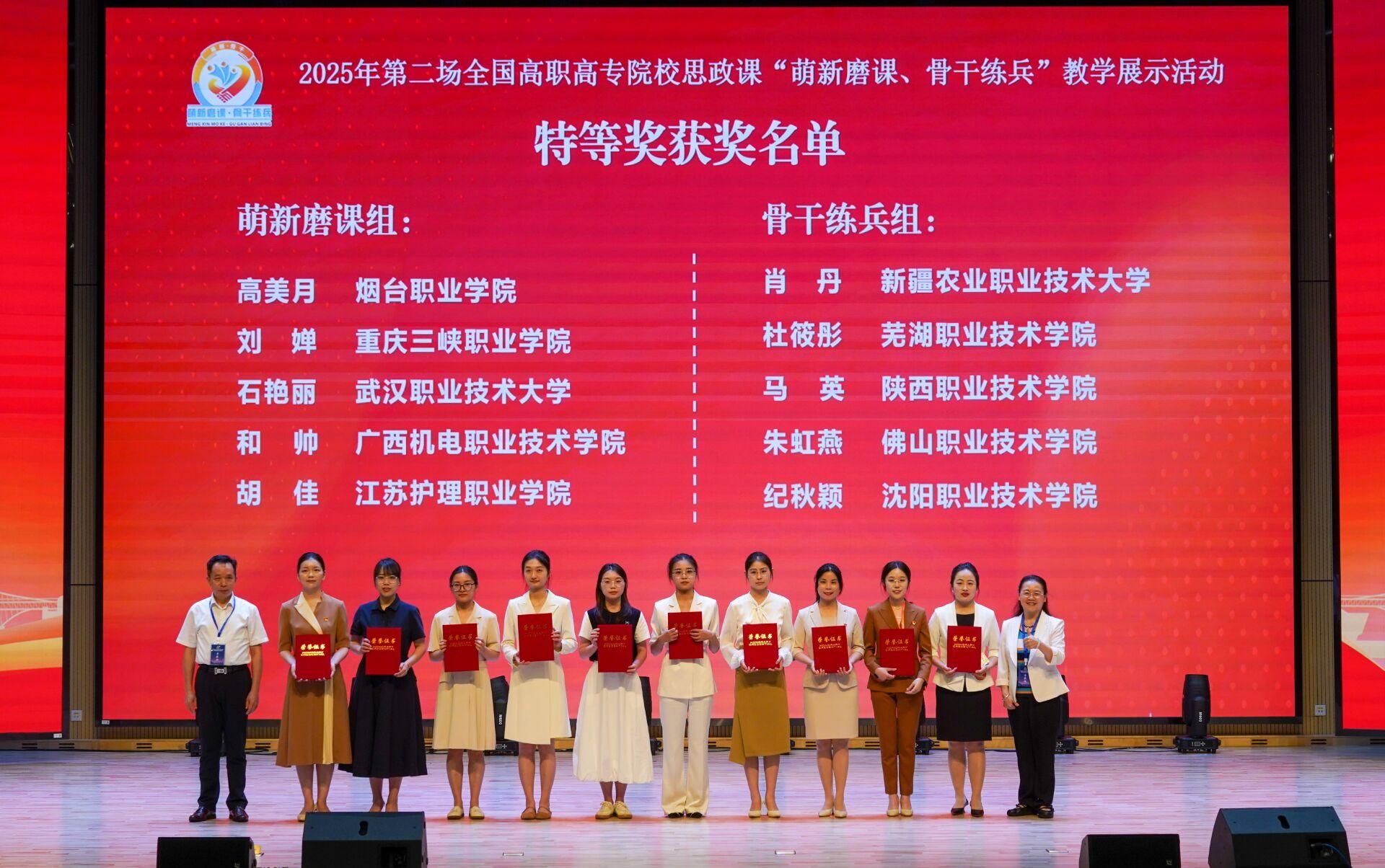 5月17日,全国高职高专院校思想政治理论课建设联盟主办的2025年第二场全国高职高专院校思政课“萌新磨课、骨干练兵”教学展示活动圆满落下帷幕。本次教学展示活动共收到“萌新磨课”组作品98个、“骨干练兵”组作品95个。经线上专家匿名评审和现场教学展示环节,共评选出“萌新磨课”组特等奖 5 个、一等奖15 个、二等奖 36 个,“骨干练兵”组特等奖 5 个、一等奖 15 个、二等奖 35 个。我校马克思主义学院思政课教师刘婵斩获《思想道德与法治》课程“萌新磨课”组全国“特等奖”,实现我校在此项赛事上新的突破!