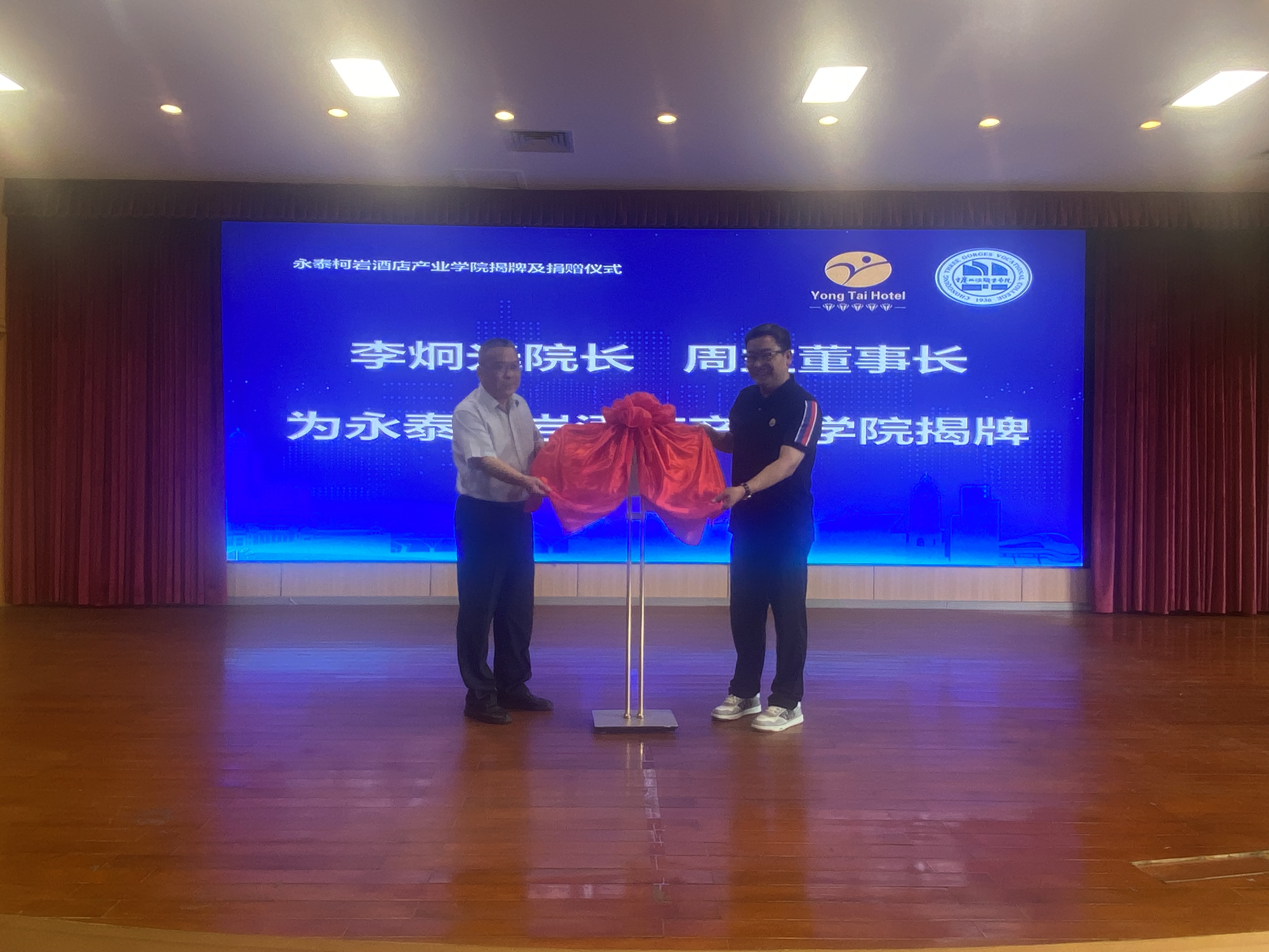 随后,李炯光院长和周立董事长共同为永泰柯岩酒店产业学院揭牌。