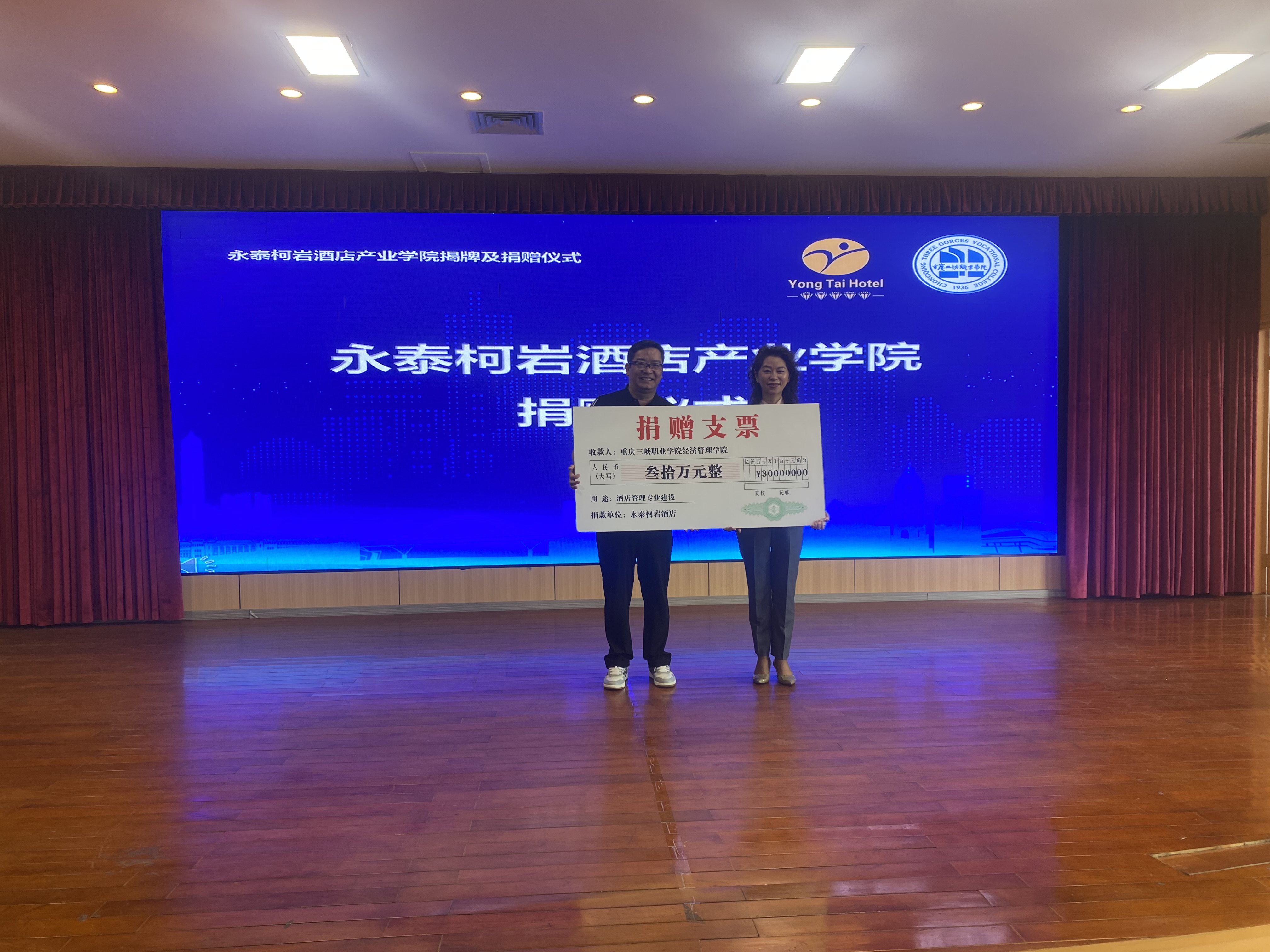 仪式上,浙江柯桥永泰柯岩酒店还向我校经济管理学院捐赠30万,用于支持酒店管理专业实训室建设和专业发展。