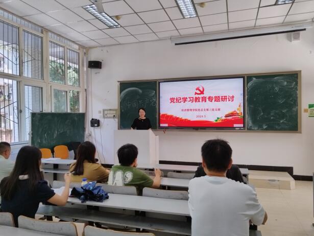 5月27日,经济管理学院党总支第三党支部在沙龙校区综合楼101教室开展党纪学习教育第三次专题研讨,会议由支部书记孙立芳主持,全体党员参加学习。