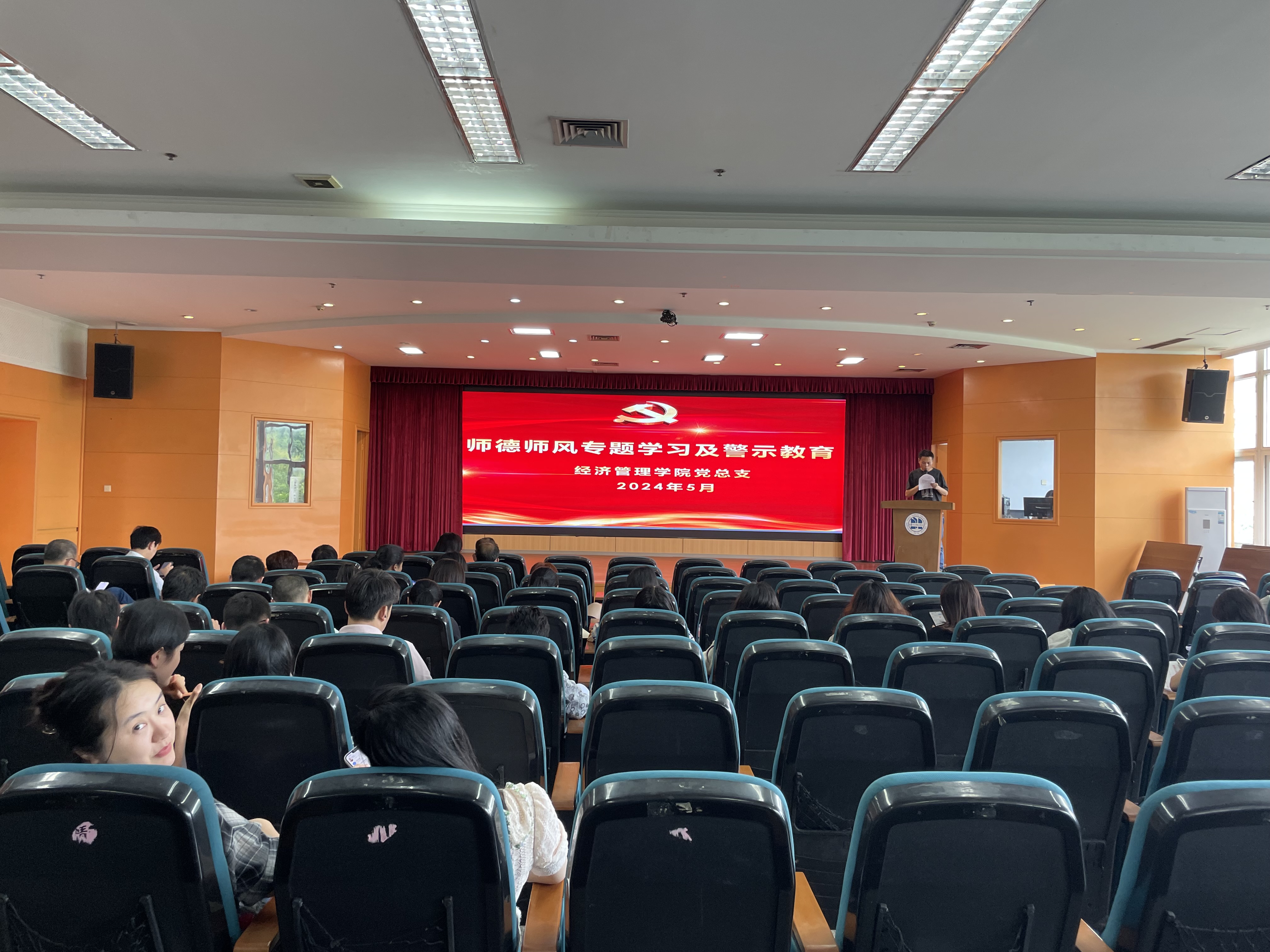 5月28日下午,经济管理学院在沙龙校区综合楼2楼学术报告厅召开5月政治理论学习和师德师风警示教育,全体教职工参加学习,会议由党总支专职组织员李静主持。
