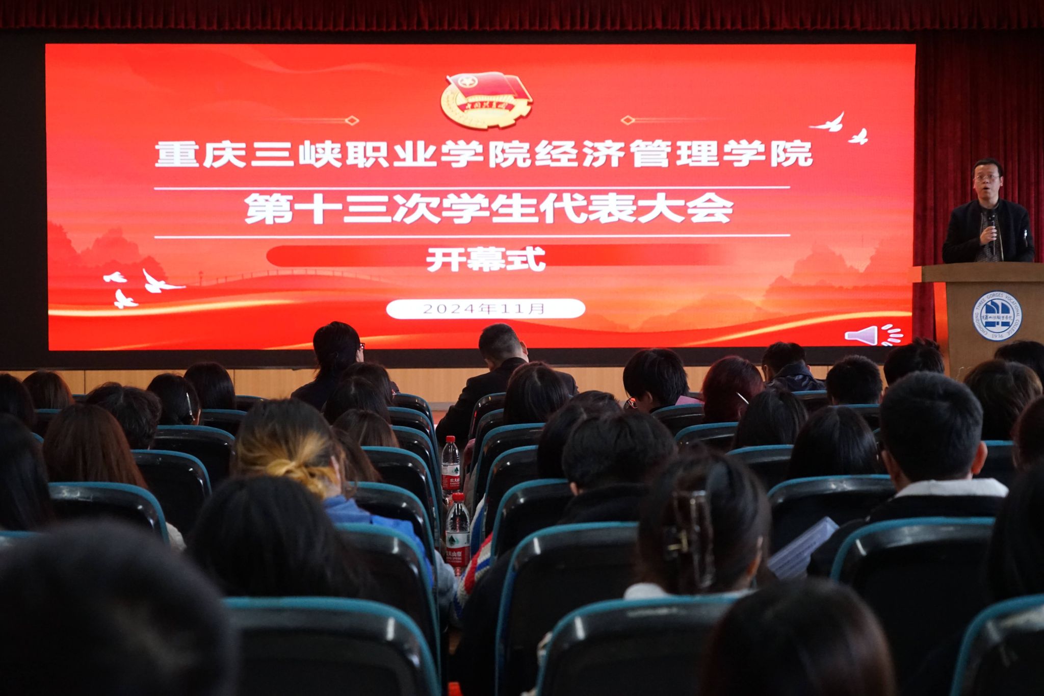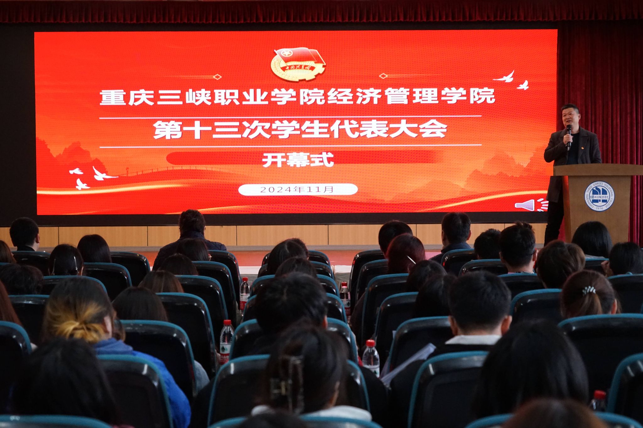 在全国上下深入学习贯彻党的二十届三中全会和全市教育大会精神之际。11月25日,重庆三峡职业学院经济管理学院第十三次学生代表大会在沙龙校区综合楼学术报告厅顺利召开。经济管理学院党总支书记、院长马绍文,副院长潘多,专职组织员李静,学工科副科长邹建华,辅导员代表、各二级学院学生会代表共计200余人参加会议。