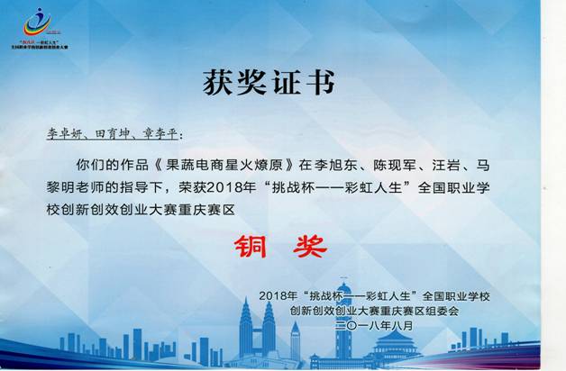 2018年5月,重庆三峡职业学院组织所有在校学生参加了“挑战杯--彩虹人生”全国职业学校创新创效创业大赛重庆赛区的比赛。经过校内初选,李卓妍等的“果蔬电商星火燎原”创新创业项目作为我校优秀作品获得参加重庆市赛的资格,后经过激烈角逐,荣获重庆赛区三等奖。
