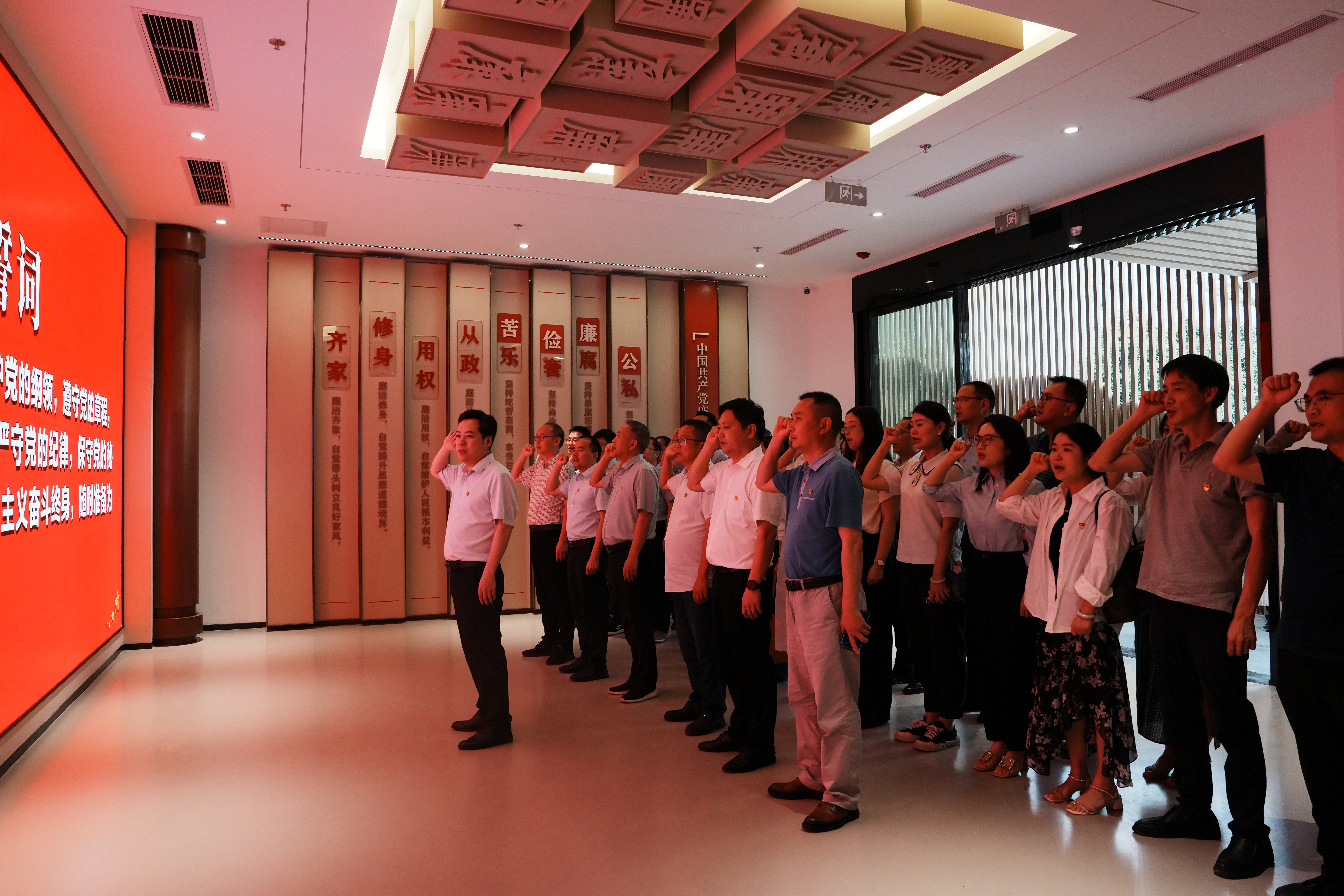首先,全体党员干部面向党旗整齐列队在党委书记谈建成的领誓下,举起右拳集体宣誓,重温入党时的庄严承诺。