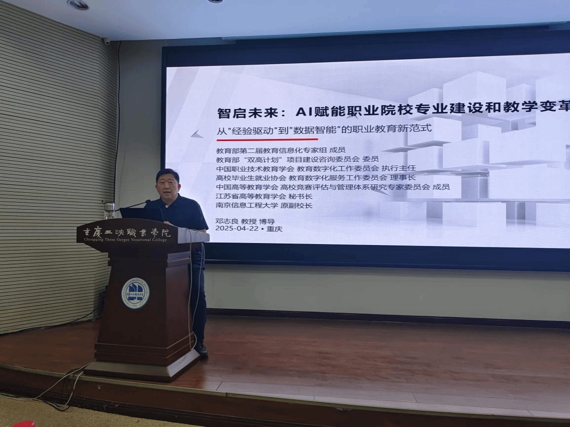 为深入贯彻落实国家关于职业教育数字化转型的战略部署,推动人工智能技术与教育教学深度融合,我校于4月22日举办“智启未来:AI赋能职业院校专业建设和教学变革”专题讲座。本次讲座特邀南京信息工程大学原副校长、中国职业技术教育学会教育数字化工作委员会执行主任邓志良教授担任主讲。会议由教务处副处长刘艳宾主持,各二级学院负责人、专业主任及骨干教师共150余人参会。