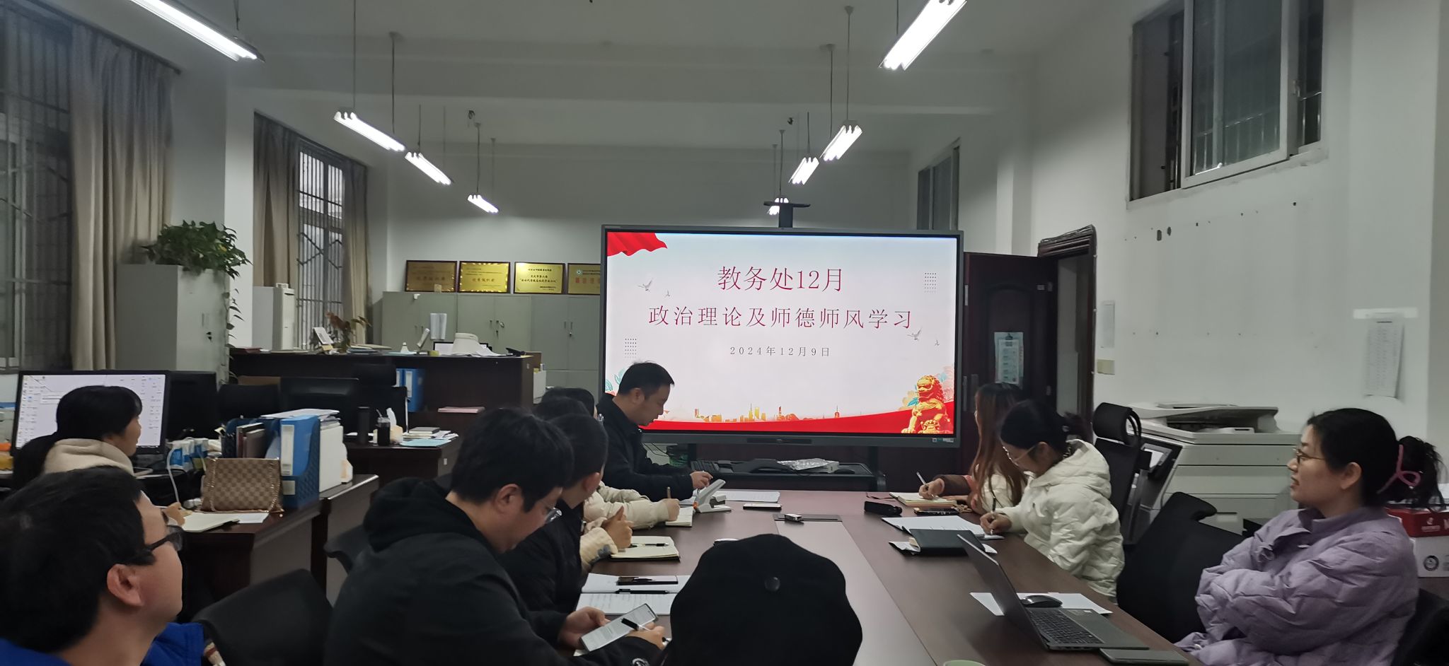 最后,杨俭副处长希望教务处全体教职工以政治理论、师德师风学习为契机,进一步强化学习,不断提升教师的政治觉悟和教育教学业务水平,加强理论武装,加强师德修养,加强师风淬炼,严格要求自身,将学习成果转化为能力提升,兢兢业业工作,展现出教师的风采。