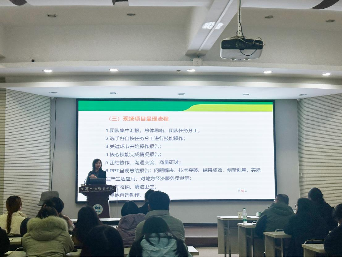 会上,专家分享了重庆市在今年世界职业院校技能大赛中的获奖情况,鼓励我院参赛队伍明确目标,提升实力,争创佳绩。随后,专家深入剖析了重庆市职业院校技能大赛新赛制,强调了备赛过程中需要注意的关键问题,重点讲解了新赛制的要求和评分标准。最后,专家就如何设计参赛项目为参赛团队提供了宝贵的思路和建议。