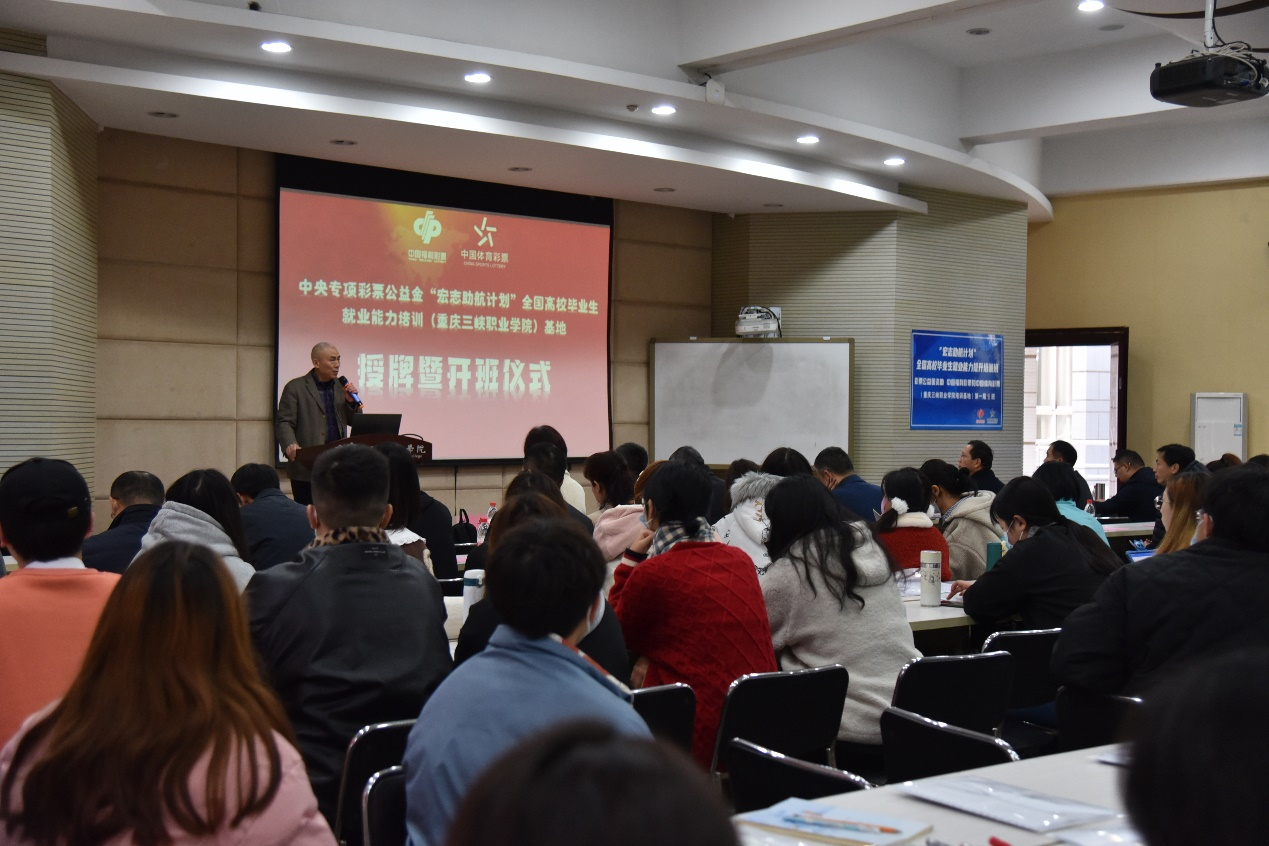 12月2日,中央专项彩票公益金“宏志助航计划”全国高校毕业生就业能力培训(重庆三峡职业学院)基地授牌暨2021年培训开班仪式在我校博雅楼207会议室举行,学院院长李炯光、副校长赵福奎,市教委二级巡视员刘宏伟、重庆市大学中专毕业生就业指导服务中心主任唐雪平、学生处副处长严平、学生处四级调研员陈卓、重庆市大学中专毕业生就业指导服务中心培训与研究部部长许杨出席。我校党政办公室、党委宣传部、学生工作部、培训学院等相关职能部门负责人,各二级学院主要负责人和分管就业的副书记,以及来自重庆三峡职业学院、重庆信息职业技术学院的83位培训学员参加此次仪式。开班仪式由赵福奎副校长主持。