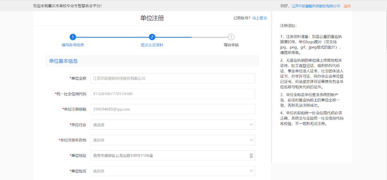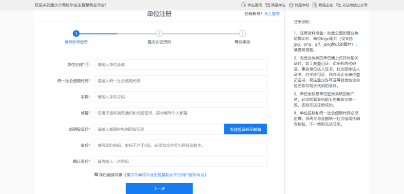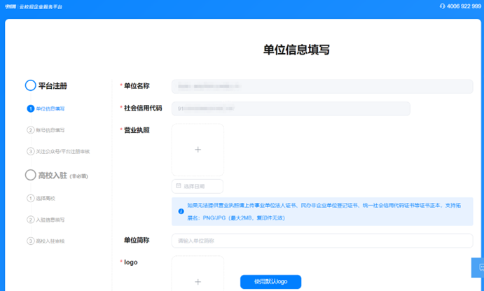 情况1:比对无误,且本单位之前未注册过云校招平台,则进入单位信息完善界面按顺序补充资料(如下图);