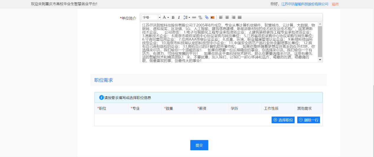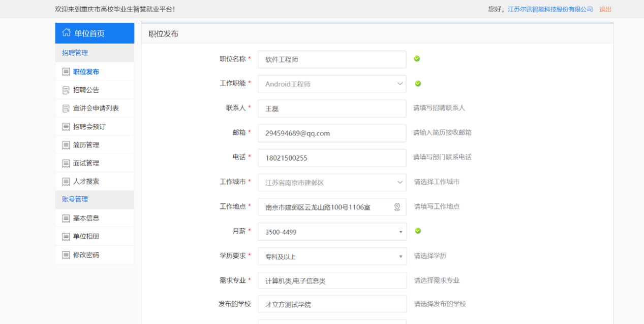 按照系统提示,进行职位信息填写,确认无误后点击【提交】,职位便提交到选择的学校,只有学校审核通过,才能发布到学校网站上。提交成功的职位如图: