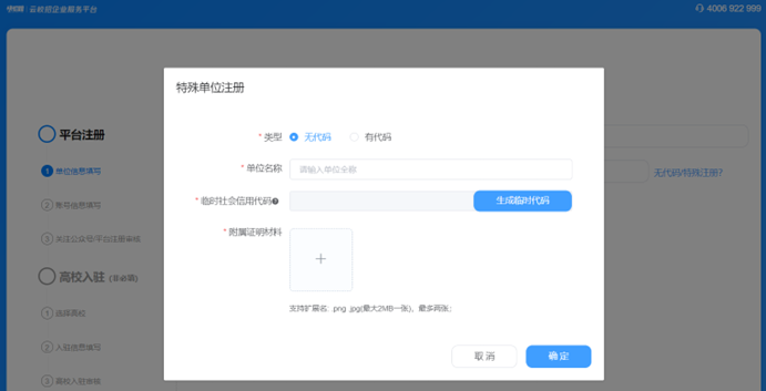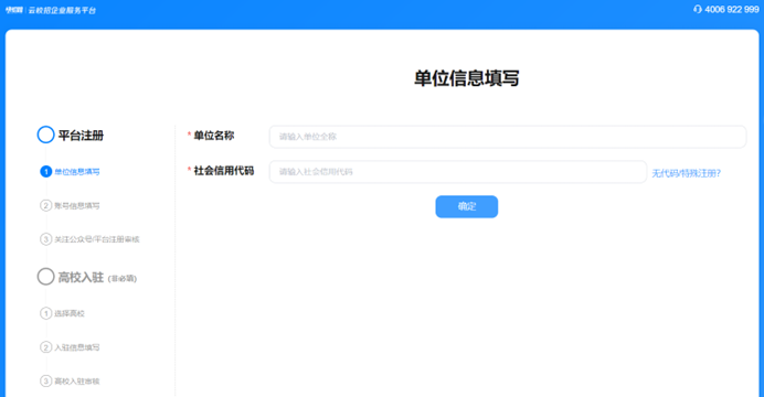 情况3:如果暂时查找不到本单位的信息,请按照提示点击右侧的“无代码特殊注册”通道,完善资料后提交(如下图)。