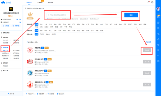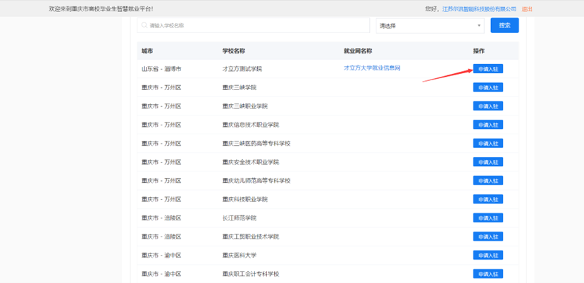 尚未入驻高校的请点击“校园招聘”中的“入驻高校”,选择“重庆三峡职业学院”并点击“入驻”。