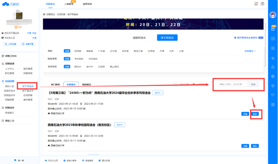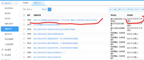 在入驻学校后,在【招聘会展位预定】这一项中选择需预定的招聘会场次,例如【重庆市2023届普通高校就业促进双选活动(万州片区专场)暨重庆三峡职业学院2023届毕业生双选会】;