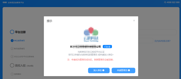 情况2:如果本单位已在云校招平台注册或认证过,管理员联系人已有变更或联系不上的话,可以选择申请成为本单位新的账号管理员,必须按照要求上传本单位加盖公章的授权公函(系统有模板);如果管理员联系人未变更,且能联系上的话,可以选择申请加入单位,选择后完善信息,即需由本单位现有管理员审核通过才行;