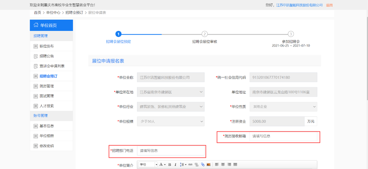 请各用人单位提前完成单位注册并选择入驻学校,待双选会正式通知确定后选择招聘会展位预定。谢谢!