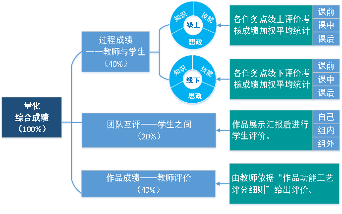 量化评价是客观化的评价方式,其综合成绩由过程成绩、团队互评成绩、作品成绩三大模块构成。
