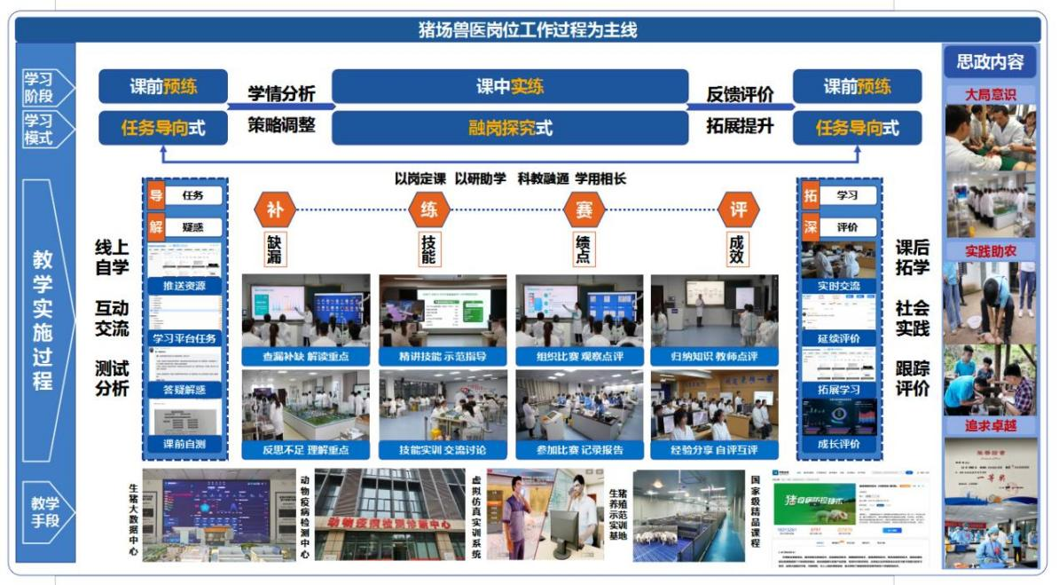 本课程依据生猪产业猪场兽医疫病防疫岗位人才培养需求和课程教学特点,准确定位教学“处方”,主动在教学中融入《集约化猪场防疫基本要求 GB/T 17823-2009》、《动物饲养场防疫准则 GB/T 39915-2021》等国家标准,针对呼吸道症状类猪疫病岗位技能要求,采用课前预练、课中实练、课后拓练的“三环”教学实施过程,将教学过程创设为“导(任务)、解(疑惑)、补(缺漏)、练(技能)、赛(绩点)、评(成效)、拓(学习)、深(评价)”八个步骤。