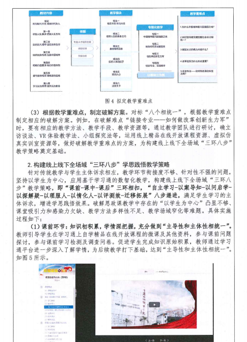 针对传统教学与学生主体诉求相左,教学环节衔接度不够、针对性不强的问题,坚持以学生为中心,以“政治性和学理性相统一”“价值性和知识性相统一”“建设性和批判性相统一”“理论性和实践性相统一”“主导性和主体性相统一”“灌输性和启发性相统一”为根本遵循,应用基于学习通的数字化教学和思政虚拟仿真教学平台资源,构建线上线下全场域“三环八步”教学策略,即“课前-课中-课后”三环相扣,“自主学习-以案导知-以问启学-以探解疑-以理服人-以情化人-以评测效-迁移拓展”八步递进,促使学生通过研讨、探究,在“学中思”、在“践中悟”,实现真学、真懂、真信、真行。