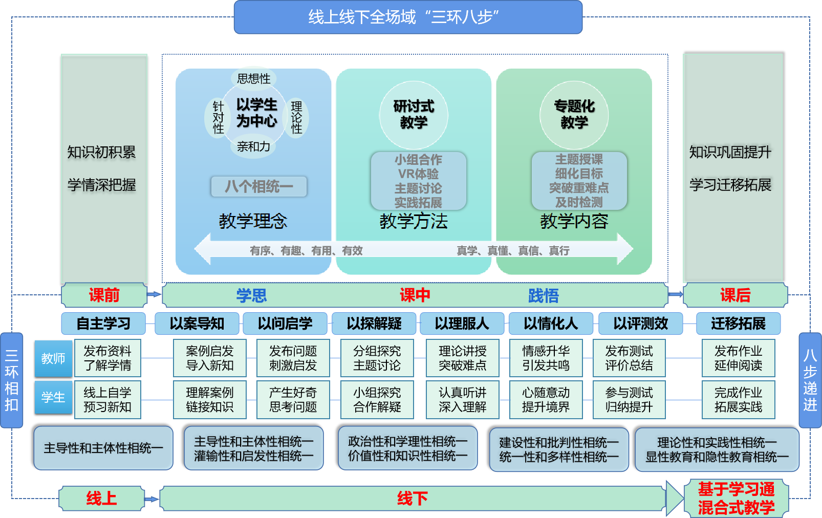 本“课堂革命”基于学生中心,构建线上线下全场域“三环八步”学思践悟教学策略。