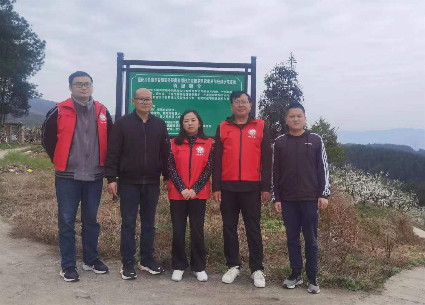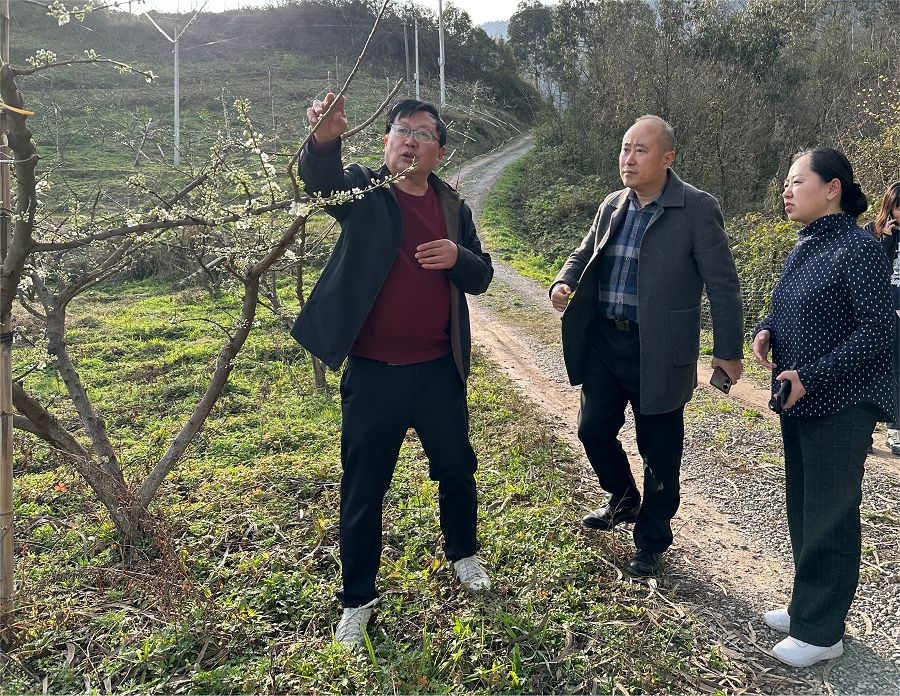 为深入学习贯彻习近平总书记关于“三农”工作的重要论述,推动科技创新事业走深走实。3月20日,春风和畅,正值李树开花授粉关键时节。万州区科技局晏东副局长一行应邀同学院科研处相关人员,分别前往分水镇、孙家镇等5个李子种植试验基地,集中对学院承担的市级乡村振兴专项等项目开展中期检查。万州区科技局副局长晏东、农业农村科何淼科长,学院科研处负责人聂青玉教授、项目管理科等相关人员随同检查。