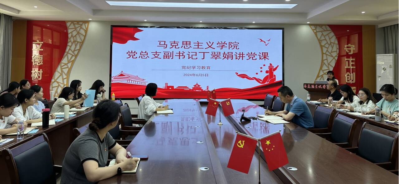 为深入学习贯彻习近平总书记关于党纪学习教育的重要讲话和重要指示精神,切实通过党纪学习教育增强党总支全体党员的廉洁自律意识、筑牢拒腐防变思想防线。6月5日,马克思主义学院党总支副书记、副院长丁翠娟围绕《中国共产党纪律处分条例》(以下简称《条例》)进行解读,为全院教师党员上了一堂党课。
