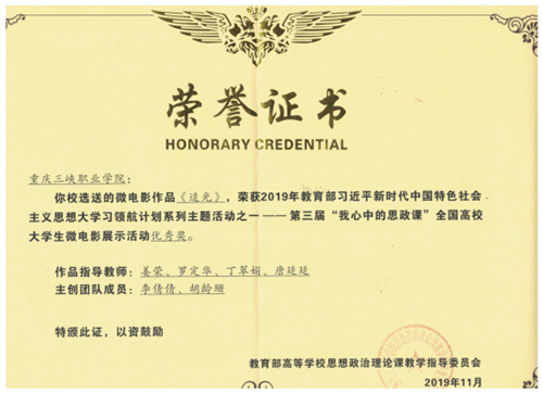 日前,由教育部社科司组织、教育部高等学校思想政治理论课教学指导委员会主办的2019年教育部习近平新时代中国特色社会主义思想大学习领航计划系列主题活动之一——第三届“我心中的思政课”全国高校大学生微电影展示活动落下帷幕。由我院创作的微电影《追光》,作为重庆市选送参加2019年教育部习近平新时代中国特色社会主义思想大学习领航计划系列主题教育之一——第三届“我心中的思政课”全国高校大学生微电影展示活动的八个作品之一,荣获优秀奖。