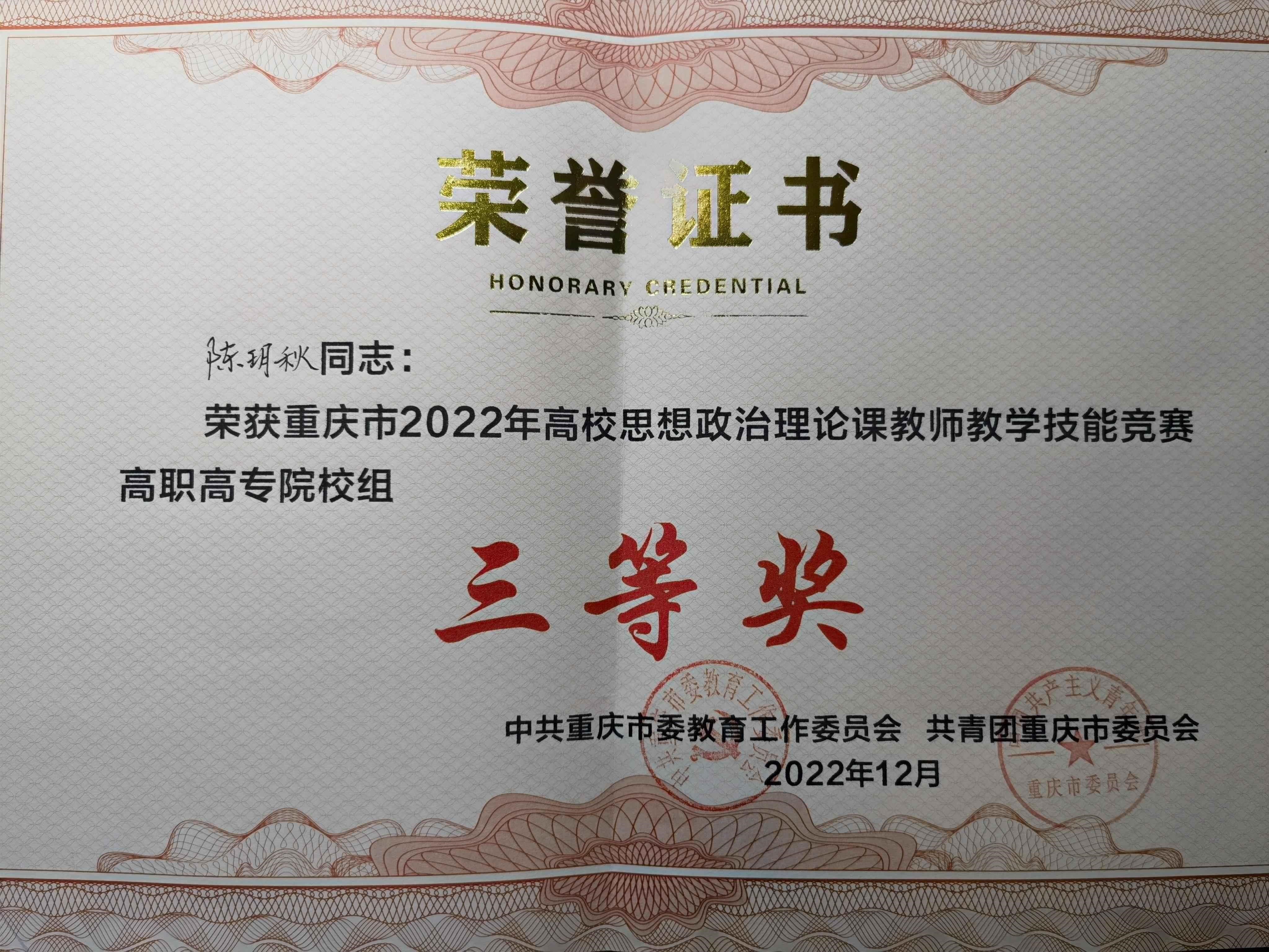 12月19日至20日,2022年重庆市高校思政课教师教学技能竞赛在重庆工程职业技术学院成功举办。马克思主义学院陈玥秋老师代表学院参加比赛,获得高职高专院校组三等奖。