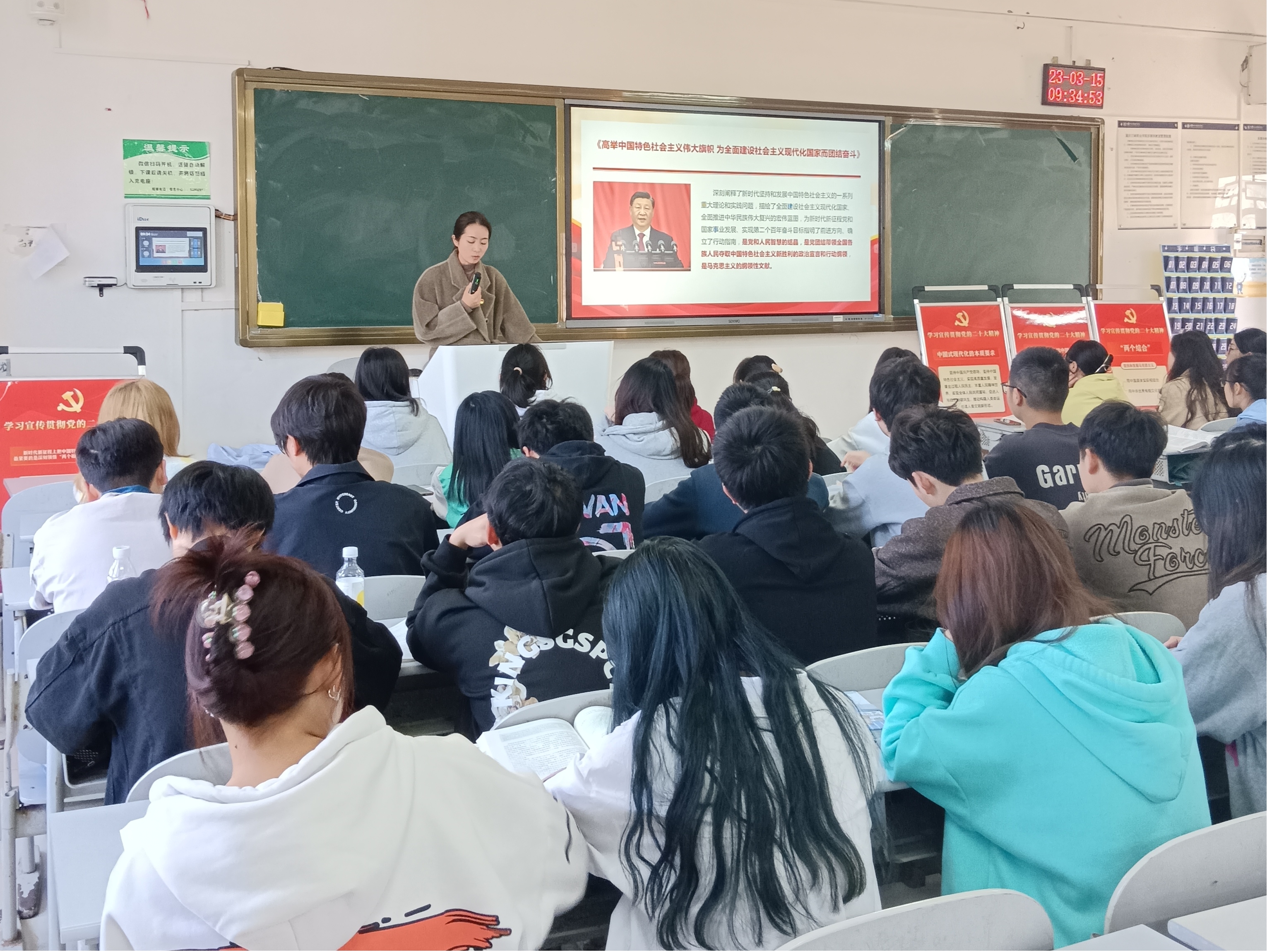 陈玥秋老师结合党的二十大报告,从党的二十大的主题和主要成果、新时代十年伟大变革的里程碑意义、马克思主义中国化时代化的精神实质、中国式现代化的丰富内涵和本质要求、全面建设社会主义现代化国家的目标任务等方面进行了全面宣讲。与此同时,联系工作实际、结合自身学习思考,通过工作体会和自身案例向在座的学生分享了作为一名青年思政课教师在自身岗位中的成长与发展,引发了学生们的思考与共鸣。