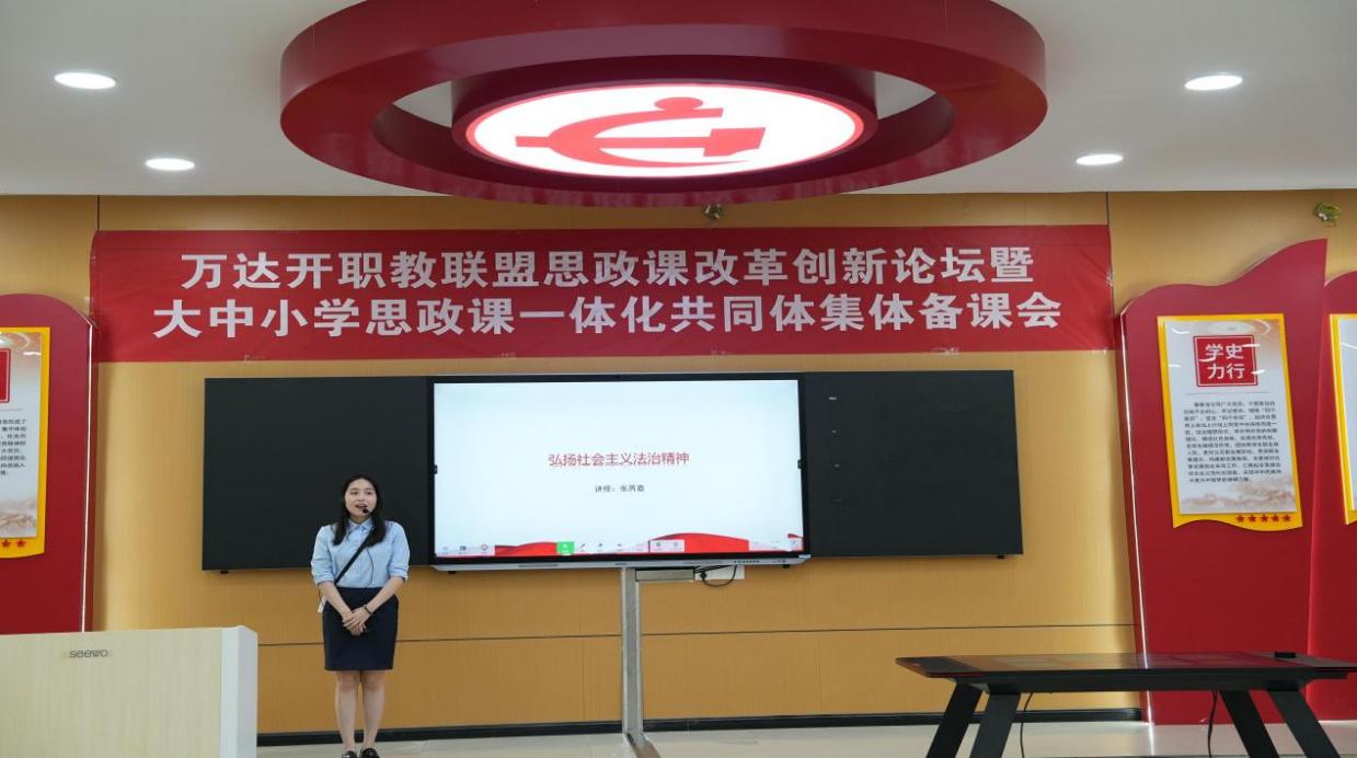 为深入推进思政课改革创新和大中小学思政课一体化建设,推动新时代学校思政课建设内涵式高质量发展,更好地用党的创新理论铸魂育人,7月5日,万达开川渝统筹发展示范区职业联盟思想政治理论课改革创新论坛暨重庆市大中小思政课一体化试点建设共同体揭牌仪式活动及集体备课会在我院隆重举行。会议由学院党委委员、宣传部部长、马克思主义学院院长姜荣主持,重庆市万州区教育委员会二级调研员林明富、学院党委副书记张智教授及达州市职业高级中学、达州职业技术学院、重庆幼儿师范高等专科学校、重庆万州技师学院、重庆市万州职业教育中心、重庆市梁平职业教育中心、重庆市开州区职业教育中心、重庆市云阳职业教育中心、重庆市万州区鹏程小学、重庆市万州区王牌小学等成员单位相关领导、教师出席本次活动。