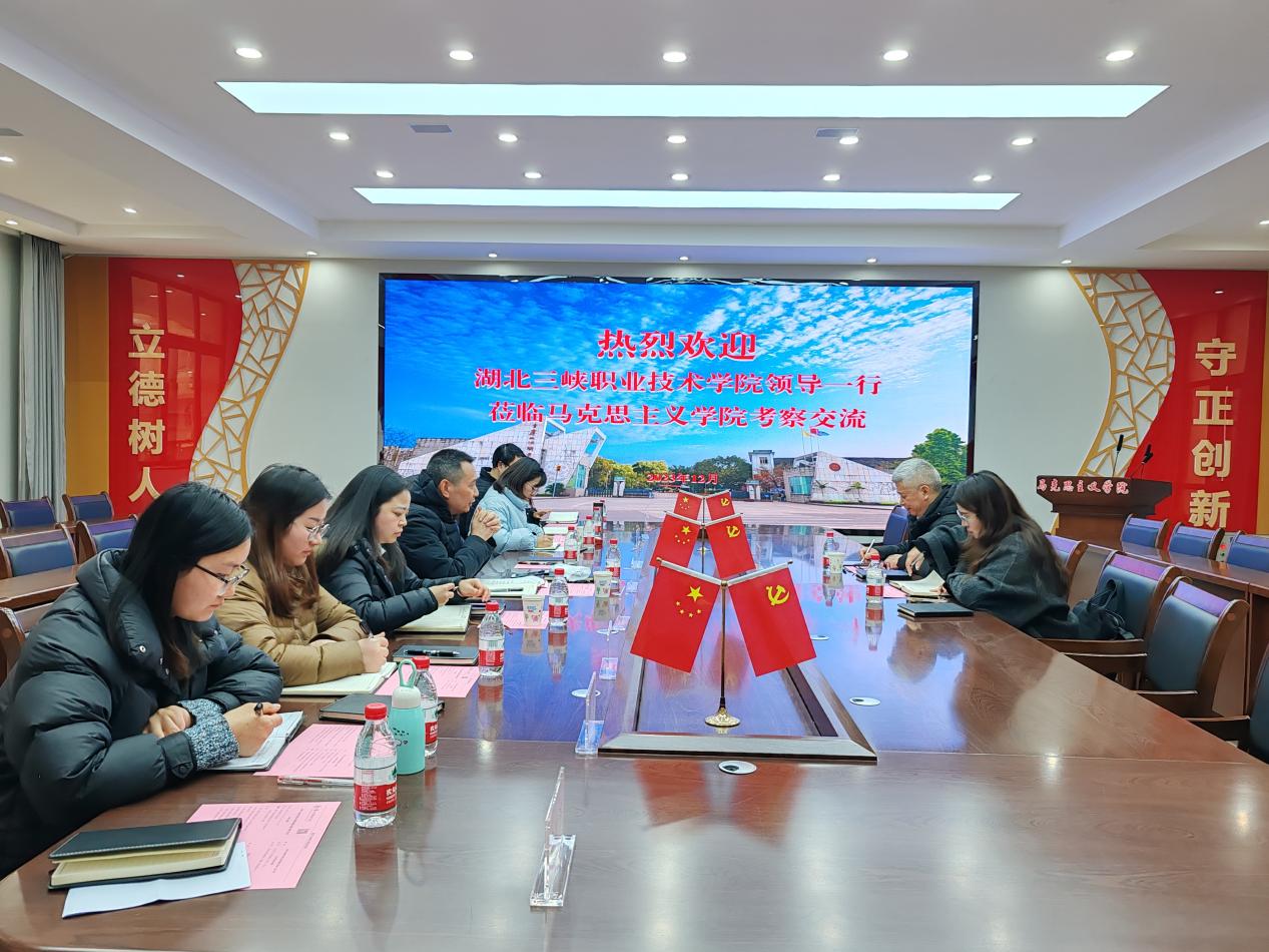 交流会上,姜院长首先对湖北三峡职业技术学院马克思主义学院院长杨子红一行表示热烈欢迎,并简要介绍了学校办学历史和马克思主义学院概况以及我校大思政课建设的工作安排和校园文化建设情况。其次,杨子红院长就湖北三峡职业技术学院和马克思主义学院建设情况做了详细介绍。杨院长表示,两校拥有相近的校名、难得的缘分,要以此契机搭建交流互鉴、学习提升的平台和机会,打破区域局限,聚多校力量开门共创共建大思政课。2023年4月,全国首个“长江大保护”大思政课项目在湖北三峡职业技术学院成功落地,该项目以“长江大保护”为主题,以多形式构建课程体系,由多部门联合开展教育的大思政课,为全国首创。此次考察交流旨在联合长江沿岸多所高职院校共同打造以“长江大保护”为主题的大思政课,即以习近平生态文明思想为理论主线,以长江沿岸生态文明建设实践为教学素材,以“一地一课双讲师”为教学形式,共建一个独具特色的教学资源库、形成一个可供跨省交流和学习研讨的思政课虚拟教研室、开通一个大中小学思政课研学渠道。杨院长指出,万州区位于长江上游地区、重庆东北部,地处三峡库区腹心,属长江上游区域中心城市,具有很多可挖掘的思政元素,此行拟邀请重庆三峡职业学院加入“长江大保护”大思政课建设项目并出席即将于2024年4月举办的成立大会。随后,湖北三峡职业技术学院党委宣传部副部长(教师工作部副部长)张小曼就思想政治和校园文化建设两方面工作进行了深入交流,并表示全校思想政治和理论武装、意识形态等工作形势复杂多变,工作重、责任大,需要走出校园,多交流沟通、互相学习共鉴。